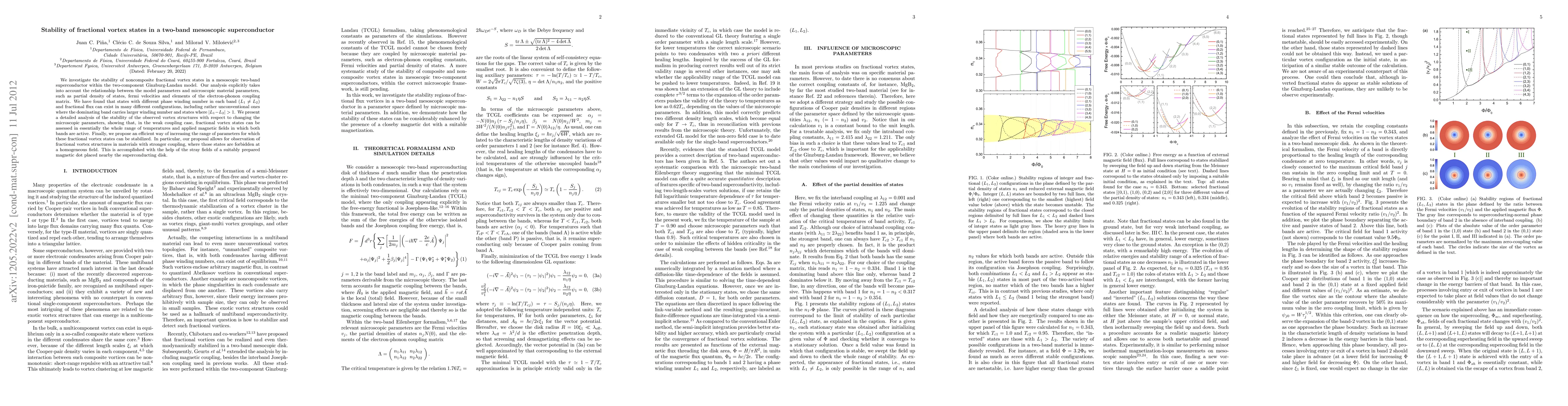 This paper explores the stability of fractional vortex states in a two-band mesoscopic superconductor using the two-component Ginzburg-Landau model, revealing unconventional configurations and proposing a method to enhance stability through stray fields from a nearby magnetic dot.