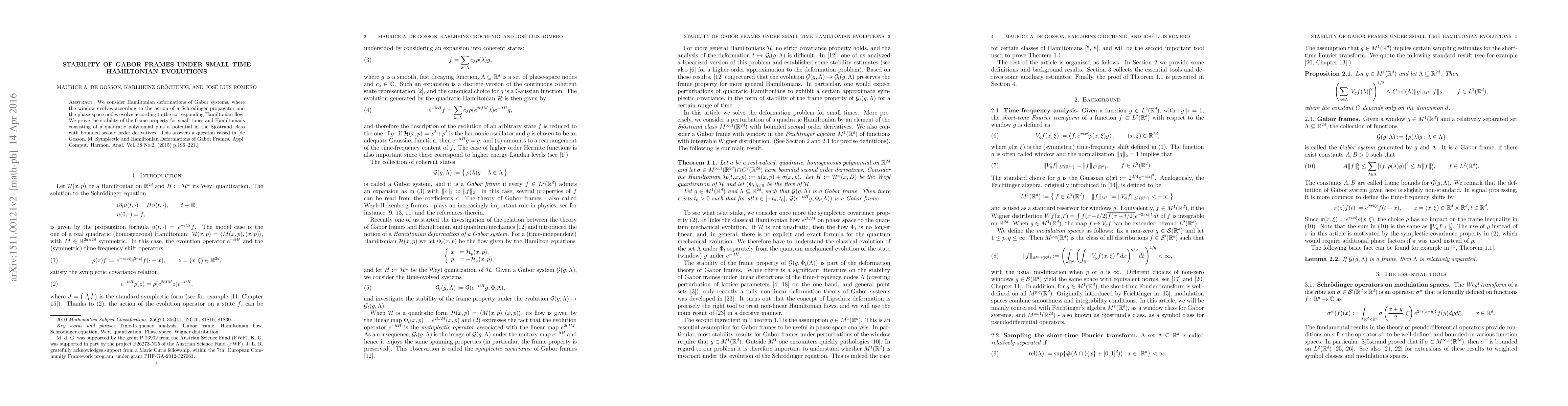 This paper investigates the stability of Gabor frames under small time Hamiltonian evolutions, proving that the frame property remains stable for small perturbations involving quadratic Hamiltonians and potentials with bounded second-order derivatives. This addresses a question posed by de Gosson regarding symplectic and Hamiltonian deformations of Gabor frames.