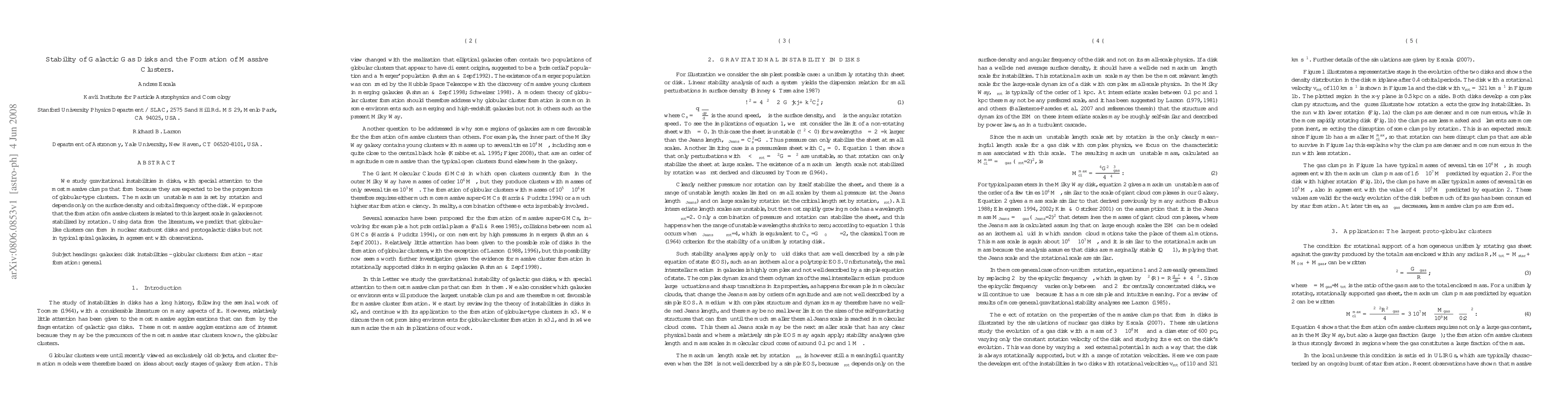 This paper investigates gravitational instabilities in galactic gas disks, focusing on the formation of massive clumps that may evolve into globular clusters. It concludes that the largest scale instabilities, influenced by rotation, determine the formation of massive clusters, predicting that such clusters form in starburst and protogalactic disks but not in typical spiral galaxies.