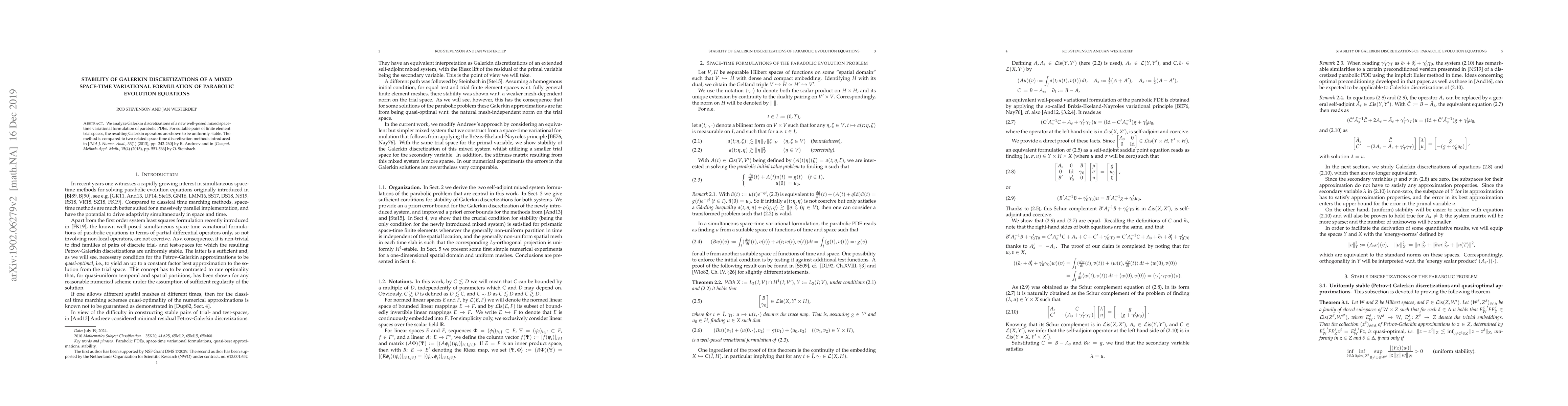 This paper analyzes the stability of Galerkin discretizations for a mixed space-time variational formulation of parabolic PDEs, proving uniform stability for appropriate finite element spaces. The method is compared to other space-time discretization techniques by Andreev and Steinbach.