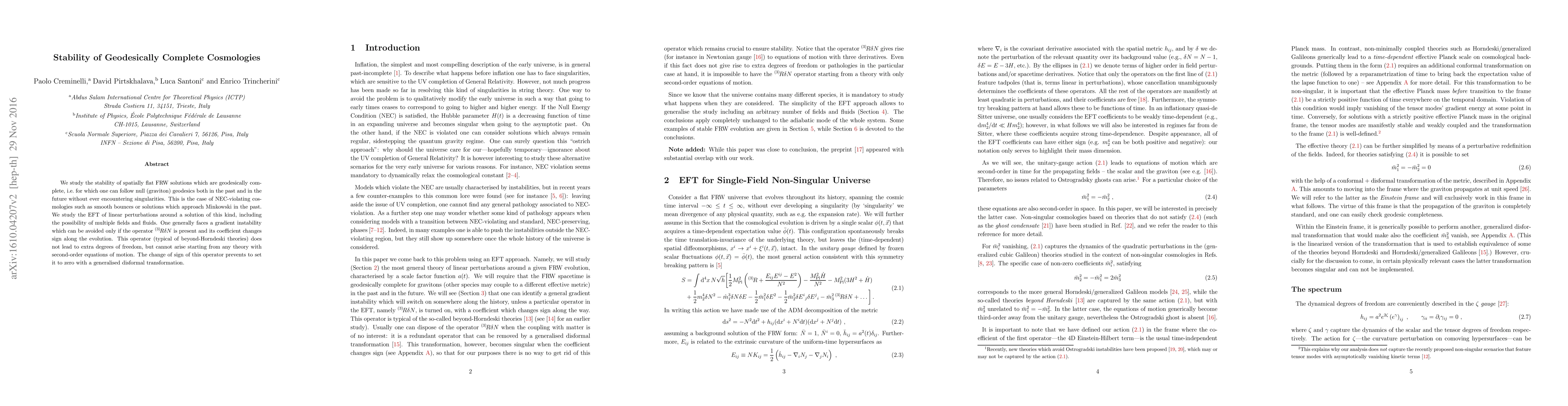 We study the stability of spatially flat FRW solutions which are geodesically complete, i.e. for which one can follow null (graviton) geodesics both in the past and in the future without ever encountering singularities. This is the case of NEC-violating cosmologies such as smooth bounces or solutions which approach Minkowski in the past. We study the EFT of linear perturbations around a solution of this kind, including the possibility of multiple fields and fluids. One generally faces a gradient instability which can be avoided only if the operator $~^{(3)}{R} \delta N~$ is present and its coefficient changes sign along the evolution. This operator (typical of beyond-Horndeski theories) does not lead to extra degrees of freedom, but cannot arise starting from any theory with second-order equations of motion. The change of sign of this operator prevents to set it to zero with a generalised disformal transformation.