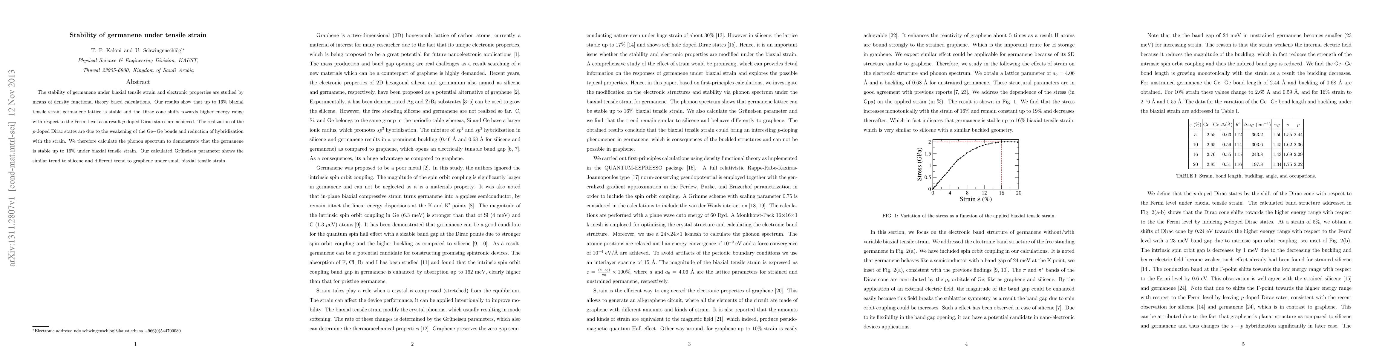 Germanene remains stable under biaxial tensile strain up to $16\%$, with a shift in the Dirac cone towards higher energy and the emergence of hole-doped Dirac states due to weakened Ge-Ge bonds and reduced s-p hybridization. The Gr\"uneisen parameter's strain dependence mirrors that of silicene, differing from graphene.