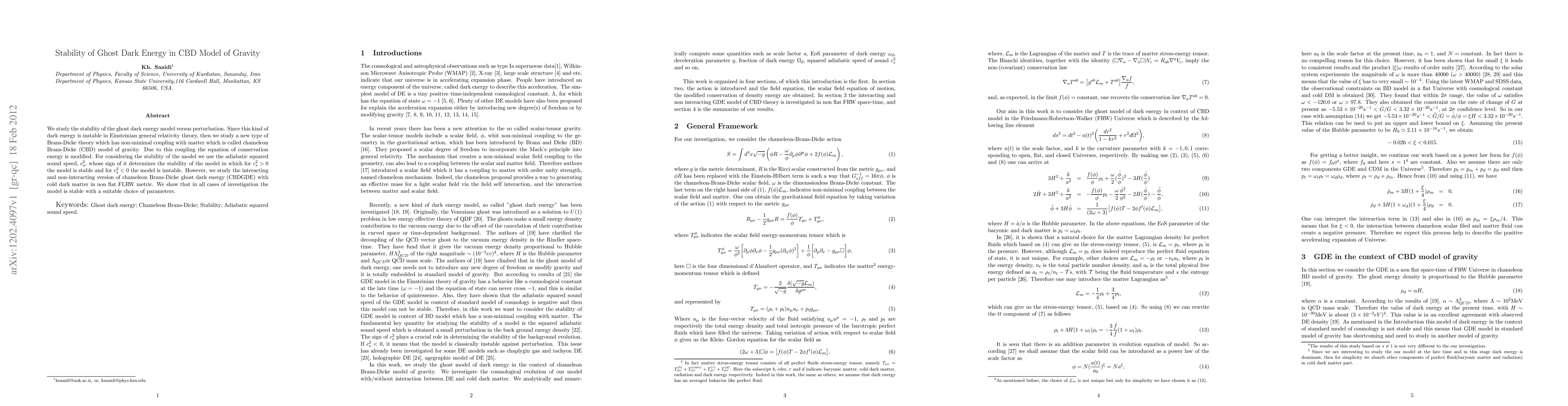 We study the stability of the ghost dark energy model versus perturbation. Since this kind of dark energy is instable in Einsteinian general relativity theory, then we study a new type of Brans-Dicke theory which has non-minimal coupling with matter which is called chameleon Brans-Dicke (CBD) model of gravity. Due to this coupling the equation of conservation energy is modified. For considering the stability of the model we use the adiabatic squared sound speed, $c_s^2$, whose sign of it determines the stability of the model in which for $c_s^2 >0 $ the model is stable and for $c_s^2 <0 $ the model is instable. However, we study the interacting and non-interacting version of chameleon Brans-Dicke ghost dark energy (CBDGDE) with cold dark matter in non flat FLRW metric. We show that in all cases of investigation the model is stable with a suitable choice of parameters.
