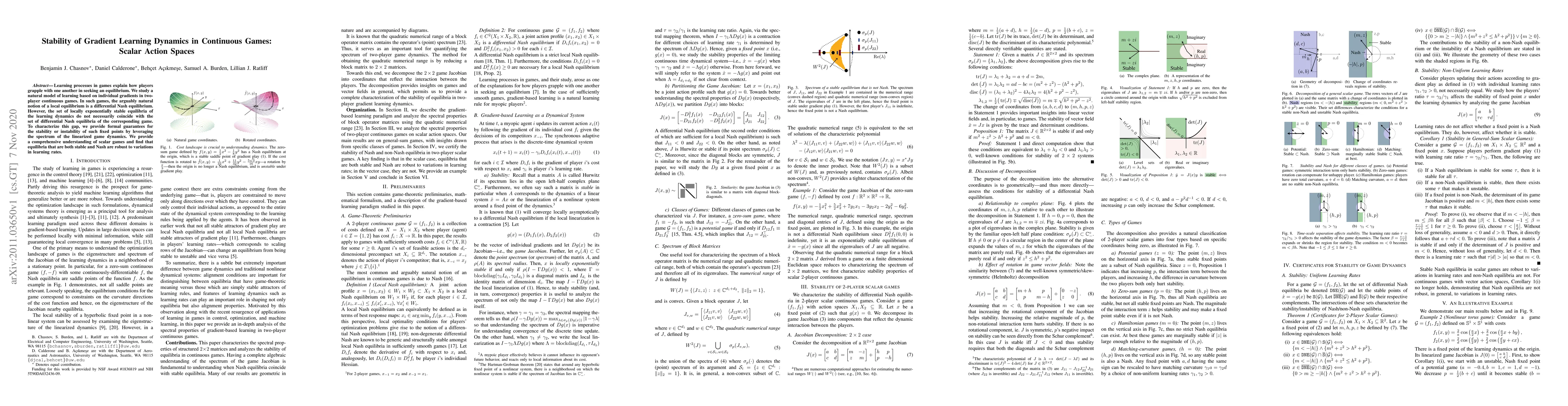 This paper investigates the stability of gradient learning dynamics in continuous two-player games, focusing on scalar action spaces. It reveals that while differential Nash equilibria represent local equilibria, not all such equilibria are stable under learning dynamics, and it provides formal stability guarantees based on the spectrum of linearized game dynamics.