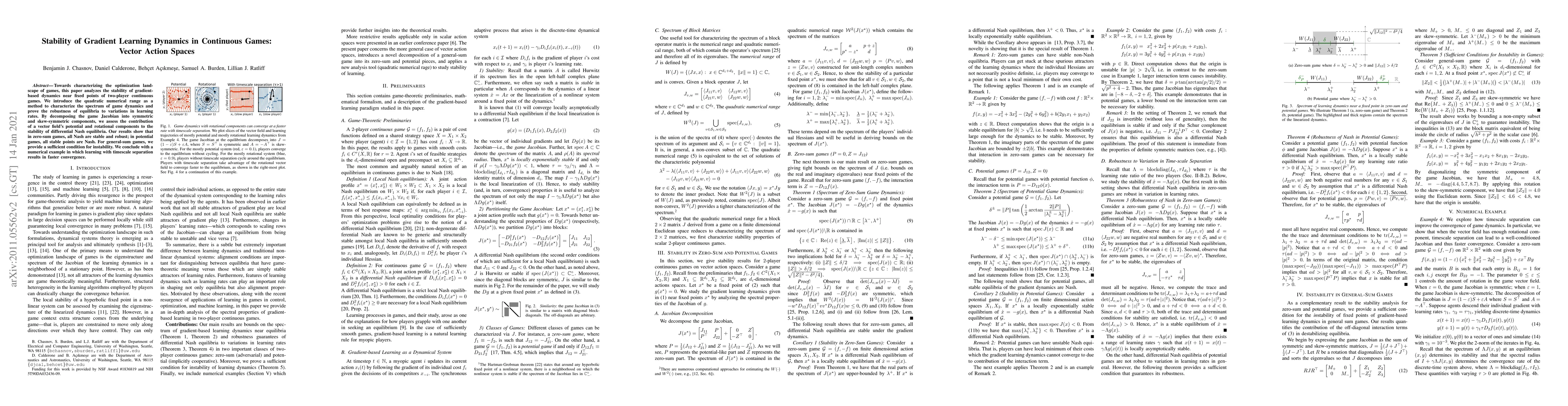 Towards characterizing the optimization landscape of games, this paper analyzes the stability of gradient-based dynamics near fixed points of two-player continuous games. We introduce the quadratic numerical range as a method to characterize the spectrum of game dynamics and prove the robustness of equilibria to variations in learning rates. By decomposing the game Jacobian into symmetric and skew-symmetric components, we assess the contribution of a vector field's potential and rotational components to the stability of differential Nash equilibria. Our results show that in zero-sum games, all Nash are stable and robust; in potential games, all stable points are Nash. For general-sum games, we provide a sufficient condition for instability. We conclude with a numerical example in which learning with timescale separation results in faster convergence.