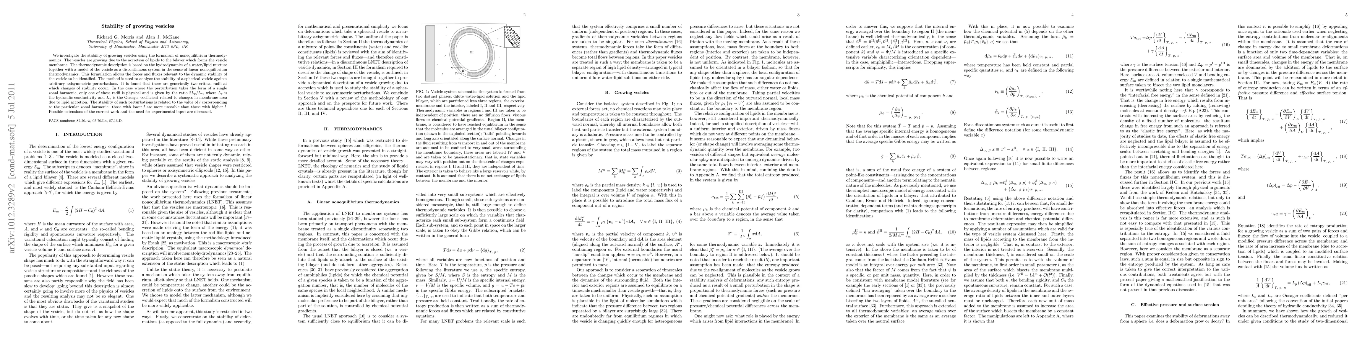 This paper examines the stability of growing vesicles through nonequilibrium thermodynamics, identifying critical radii for stability changes and determining that perturbations with lower zonal harmonic values are more unstable. The analysis reveals a dependency on hydraulic conductivity and Onsager coefficient related to lipid accretion.