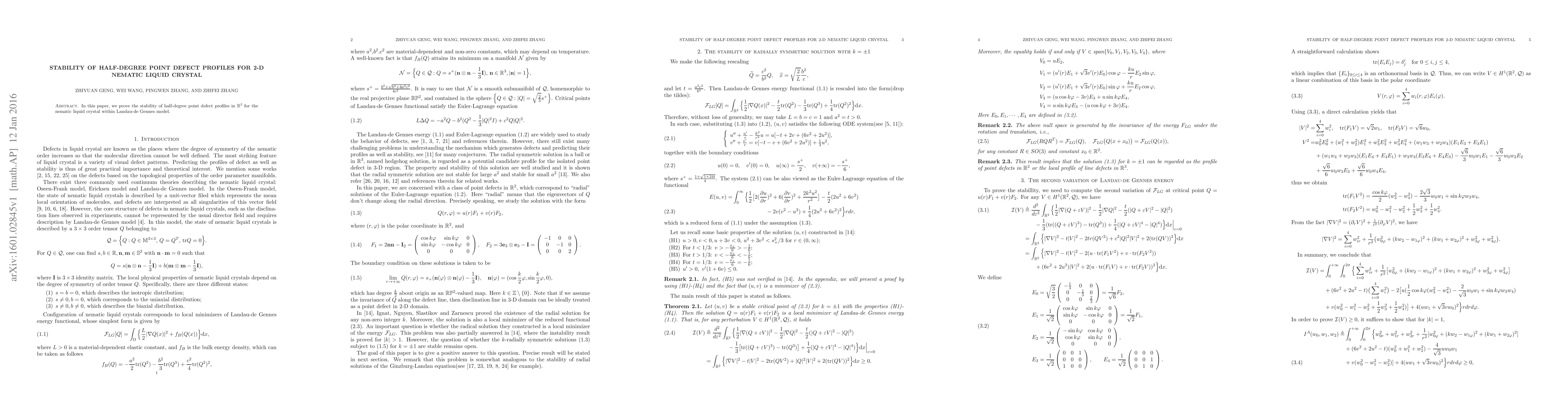 This paper proves the stability of half-degree point defect profiles in 2D nematic liquid crystals under the Landau-de Gennes theoretical framework. The findings contribute to the understanding of defect stability in nematic phases.