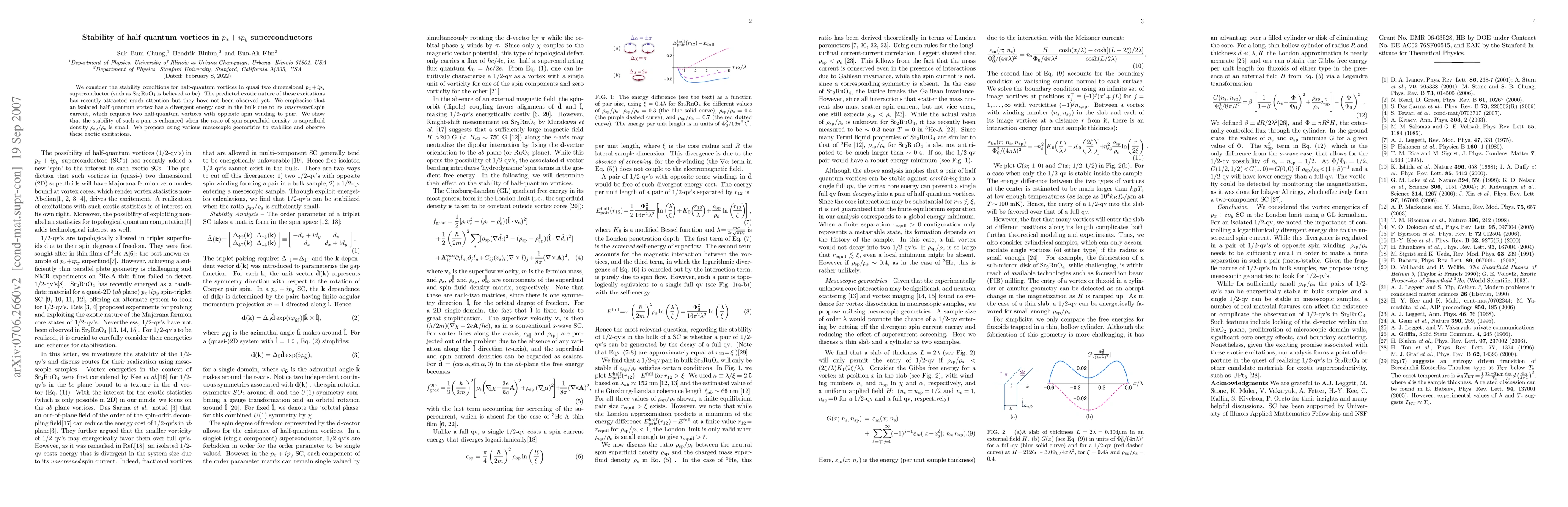 We consider the stability conditions for half-quantum vortices in quasi two dimensional $p_x+ip_y$ superconductor (such as ${\rm Sr_2 RuO_4}$ is believed to be) through energetics calculations. Although the predicted exotic nature of these excitations have recently attracted much attention but they have not been observed yet. We pay particular attention to the fact that an isolated half quantum vortex has a divergent energy cost in the bulk due to the associated {\it unscreened} spin current, which requires two half-quantum vortices with opposite spin winding to pair. We show that the stability of such a pair in bulk is enhanced when the ratio of spin superfluid density to superfluid density $\rho_{{\rm sp}}/\rho_{\rm s}$ is small. As a step towards stabilizing and observing these exotic excitations, we propose using various mesoscopic geometries. We find that certain mesoscopic geometries can selectively allow only single half-quantum vortices to enter the sample for small $\rho_{{\rm sp}}/\rho_{\rm s}$.