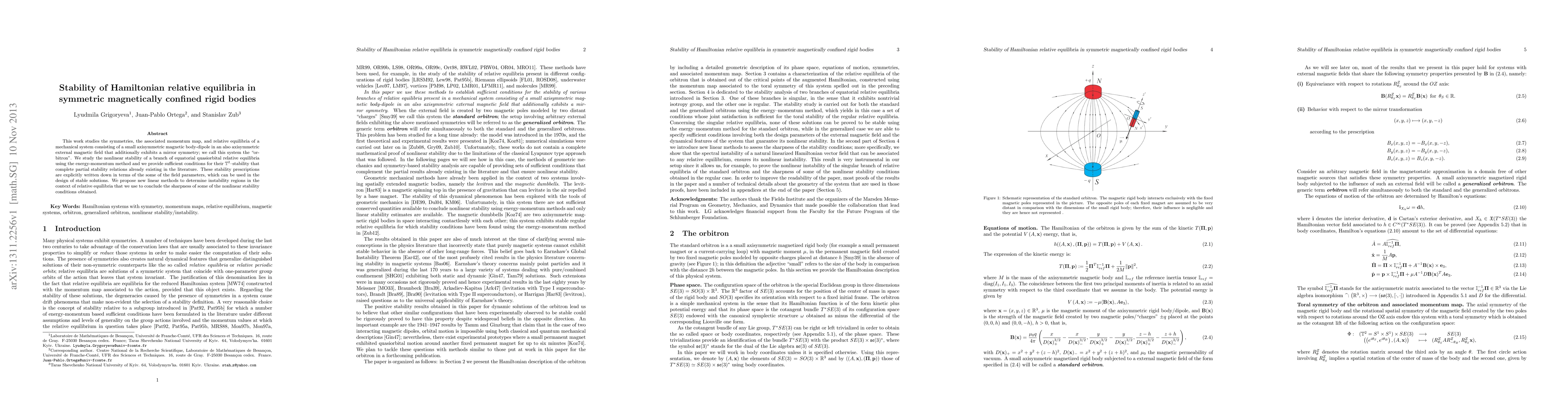 This work studies the symmetries, the associated momentum map, and relative equilibria of a mechanical system consisting of a small axisymmetric magnetic body-dipole in an also axisymmetric external magnetic field that additionally exhibits a mirror symmetry; we call this system the ``orbitron". We study the nonlinear stability of a branch of equatorial quasiorbital relative equilibria using the energy-momentum method and we provide sufficient conditions for their $\mathbb{T}^2$--stability that complete partial stability relations already existing in the literature. These stability prescriptions are explicitly written down in terms of the some of the field parameters, which can be used in the design of stable solutions. We propose new linear methods to determine instability regions in the context of relative equilibria that we use to conclude the sharpness of some of the nonlinear stability conditions obtained.