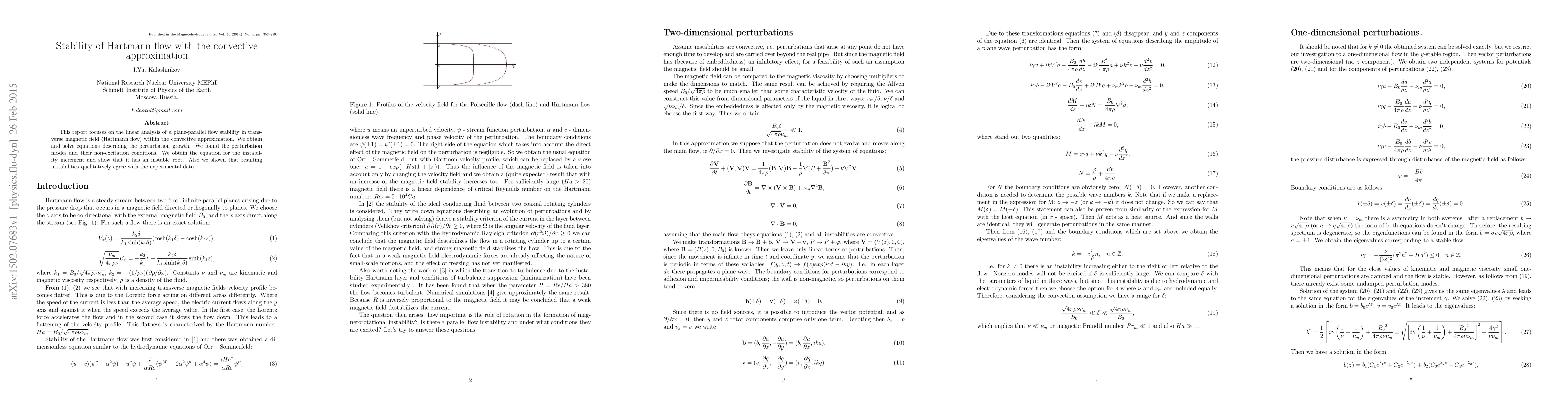 This study investigates the stability of Hartmann flow under a convective approximation through linear analysis, deriving equations for perturbation growth and identifying instability conditions. The derived instability increment equation reveals an unstable root, with results aligning qualitatively with experimental data.