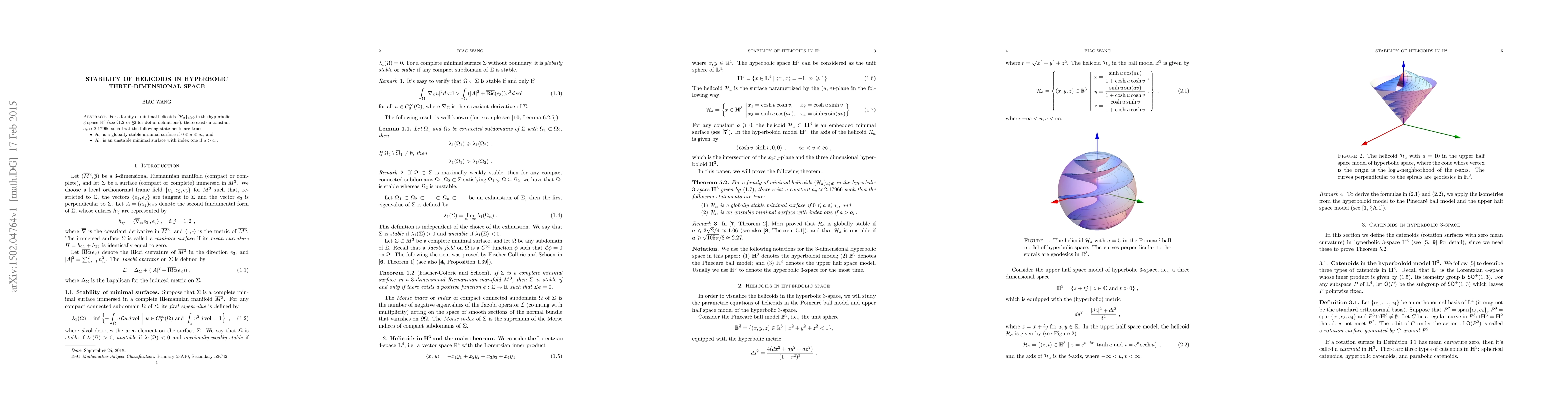 For a family of minimal helicoids H_a in the hyperbolic 3-space, there exists a constant a_c=2.17966 such that the following statements are true: (1) H_a is a globally stable minimal surface if 0<=a<=a_c, and (2) H_a is an unstable minimal surface with index one if a>a_c.
