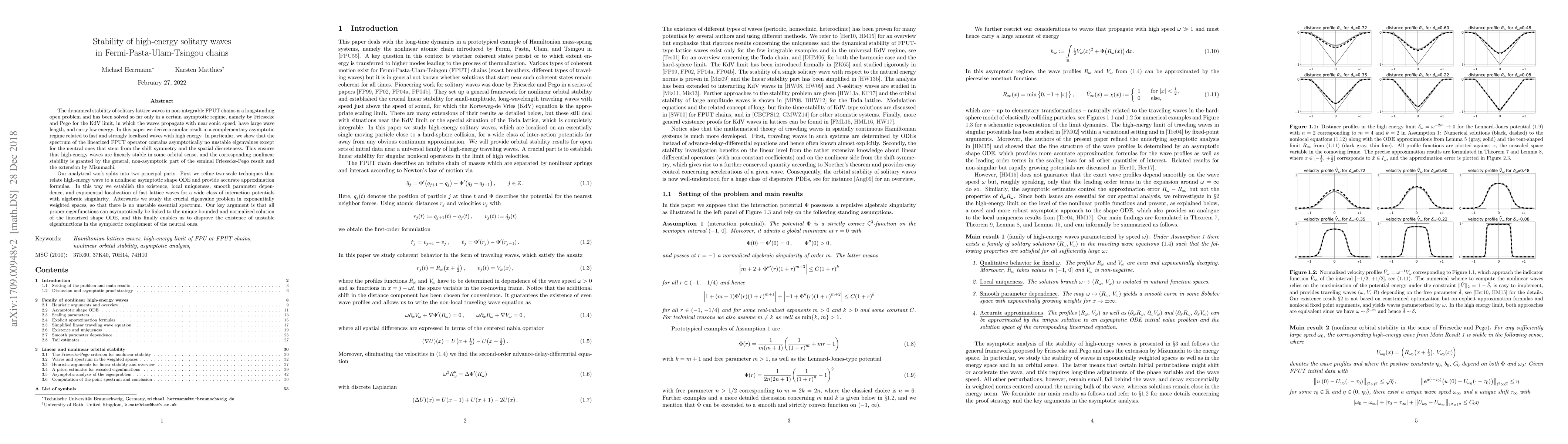 The dynamical stability of solitary lattice waves in non-integrable FPUT chains is a longstanding open problem and has been solved so far only in a certain asymptotic regime, namely by Friesecke and Pego for the KdV limit, in which the waves propagate with near sonic speed, have large wave length, and carry low energy. In this paper we derive a similar result in a complementary asymptotic regime related to fast and strongly localized waves with high energy. In particular, we show that the spectrum of the linearized FPUT operator contains asymptotically no unstable eigenvalues except for the neutral ones that stem from the shift symmetry and the spatial discreteness. This ensures that high-energy waves are linearly stable in some orbital sense, and the corresponding nonlinear stability is granted by the general, non-asymptotic part of the seminal Friesecke-Pego result and the extension by Mizumachi. Our analytical work splits into two principal parts. First we refine two-scale techniques that relate high-energy wave to a nonlinear asymptotic shape ODE and provide accurate approximation formulas. In this way we establish the existence, local uniqueness, smooth parameter dependence, and exponential localization of fast lattice waves for a wide class of interaction potentials with algebraic singularity. Afterwards we study the crucial eigenvalue problem in exponentially weighted spaces, so that there is no unstable essential spectrum. Our key argument is that all proper eigenfunctions can asymptotically be linked to the unique bounded and normalized solution of the linearized shape ODE, and this finally enables us to disprove the existence of unstable eigenfunctions in the symplectic complement of the neutral ones.