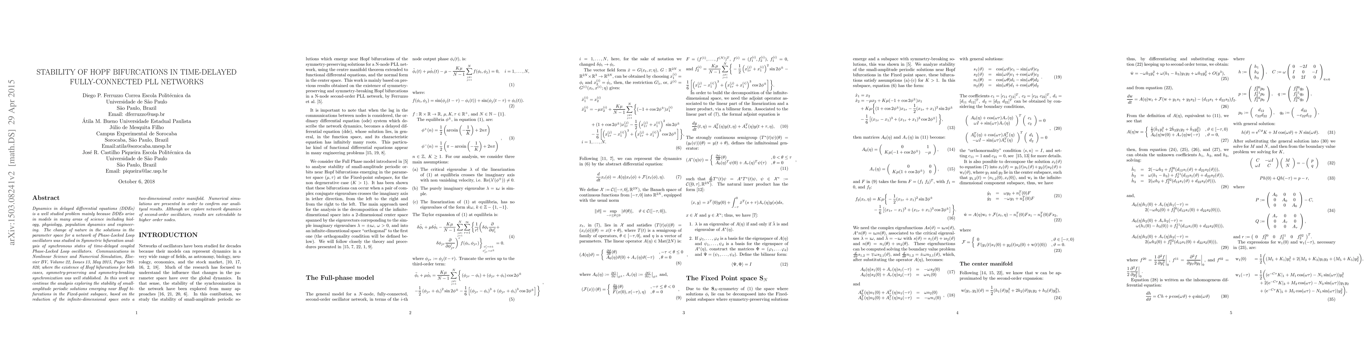 Dynamics in delayed differential equations (DDEs) is a well studied problem mainly because DDEs arise in models in many areas of science including biology, physiology, population dynamics and engineering. The change of nature in the solutions in the parameter space for a network of Phase-Locked Loop oscillators was studied in \textit{Symmetric bifurcation analysis of synchronous states of time-delayed coupled Phase-Locked Loop oscillators}. Communications in Nonlinear Science and Numerical Simulation, Elsevier BV, Volume 22, Issues 1-3, May 2015, Pages 793-820, where the existence of Hopf bifurcations for both cases, symmetry-preserving and symmetry-breaking synchronization was well stablished. In this work we continue the analysis exploring the stability of small-amplitude periodic solutions emerging near Hopf bifurcations in the Fixed-point subspace, based on the reduction of the infinite-dimensional space onto a two-dimensional center manifold. Numerical simulations are presented in order to confirm our analitycal results. Although we explore network dynamics of second-order oscillators, results are extendable to higher order nodes.