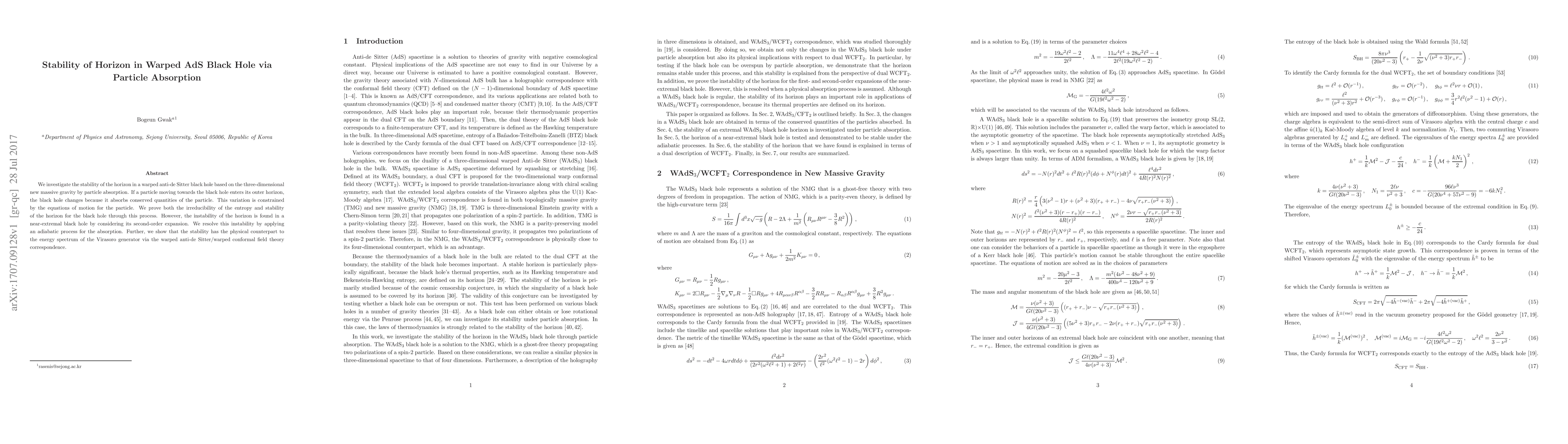 This research proves the irreducibility of entropy and stability of the horizon in warped AdS black holes via particle absorption in new massive gravity. It also identifies and resolves horizon instability in near-extremal cases through adiabatic absorption, linking stability to Virasoro generator energy spectrum via AdS/CFT correspondence.