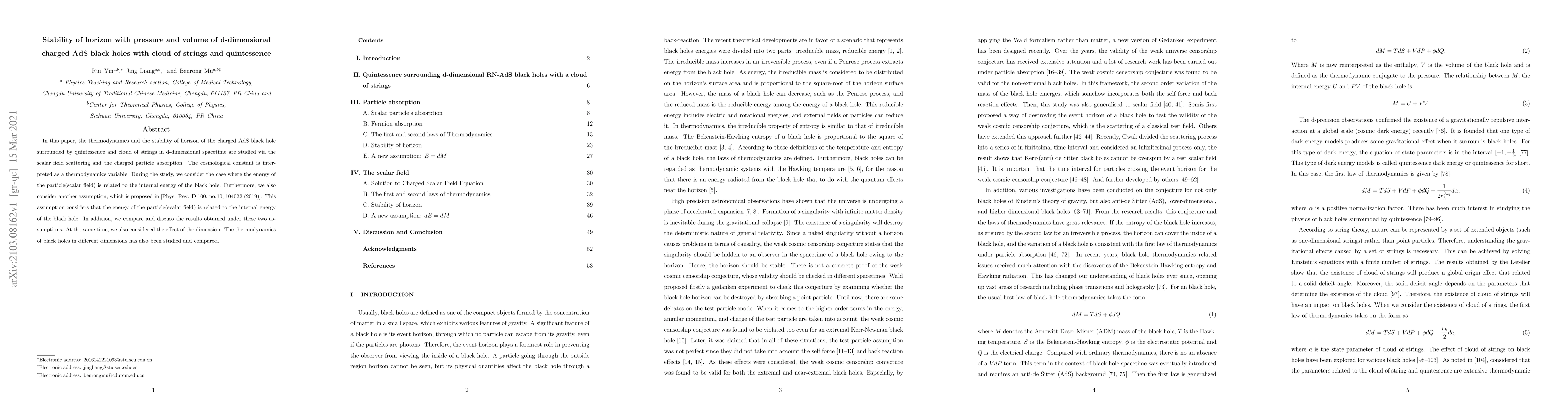 This paper investigates the thermodynamics and horizon stability of charged d-dimensional AdS black holes enveloped by quintessence and a cloud of strings, using scalar field scattering and charged particle absorption. It compares results under two assumptions regarding the energy relation between particles and black hole internal energy, and examines the impact of dimensionality on black hole thermodynamics.