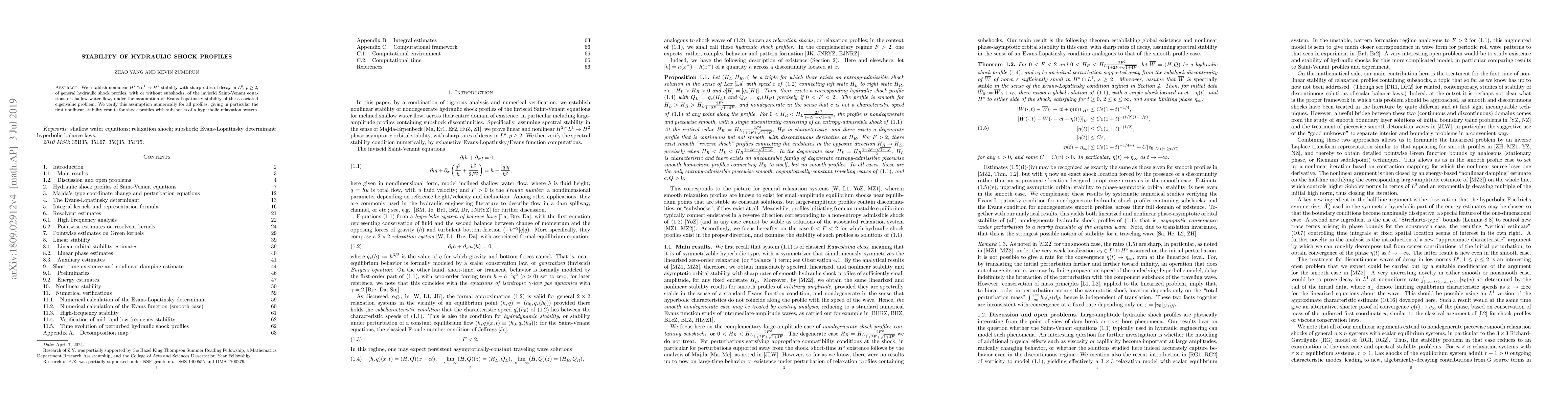 This paper proves nonlinear stability with precise decay rates for hydraulic shock profiles in shallow water flow, including those with subshocks, under an Evans-Lopatinsky stability assumption verified numerically, marking the first nonlinear stability results for such profiles in a hyperbolic relaxation system.