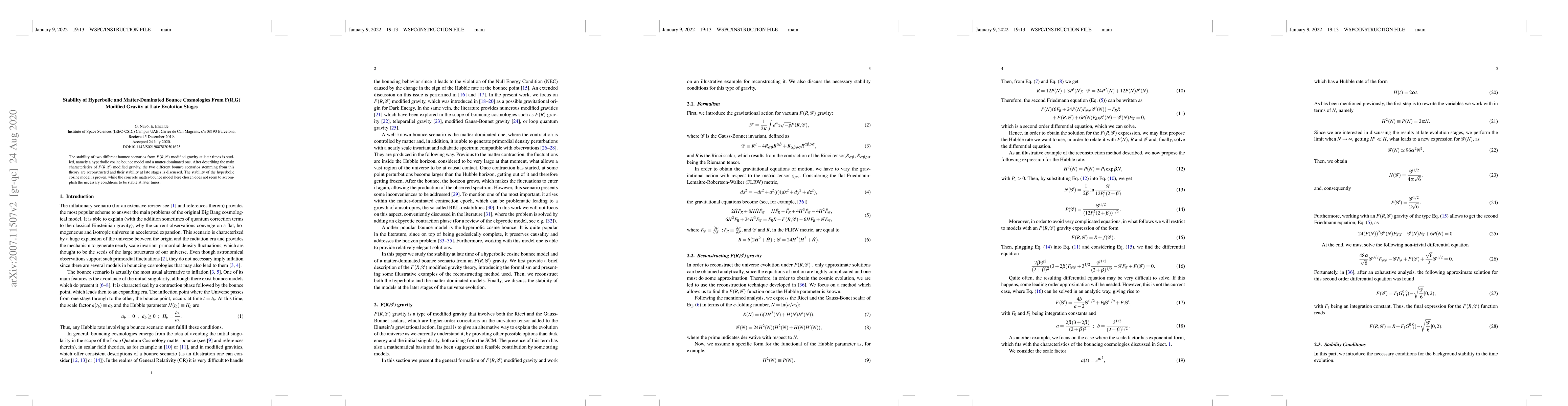 This paper investigates the stability of two bounce scenarios—hyperbolic cosine and matter-dominated—in F(R,G) modified gravity at late evolution stages. The hyperbolic cosine model proves stable, whereas the chosen matter-bounce model does not meet the stability criteria at later times.