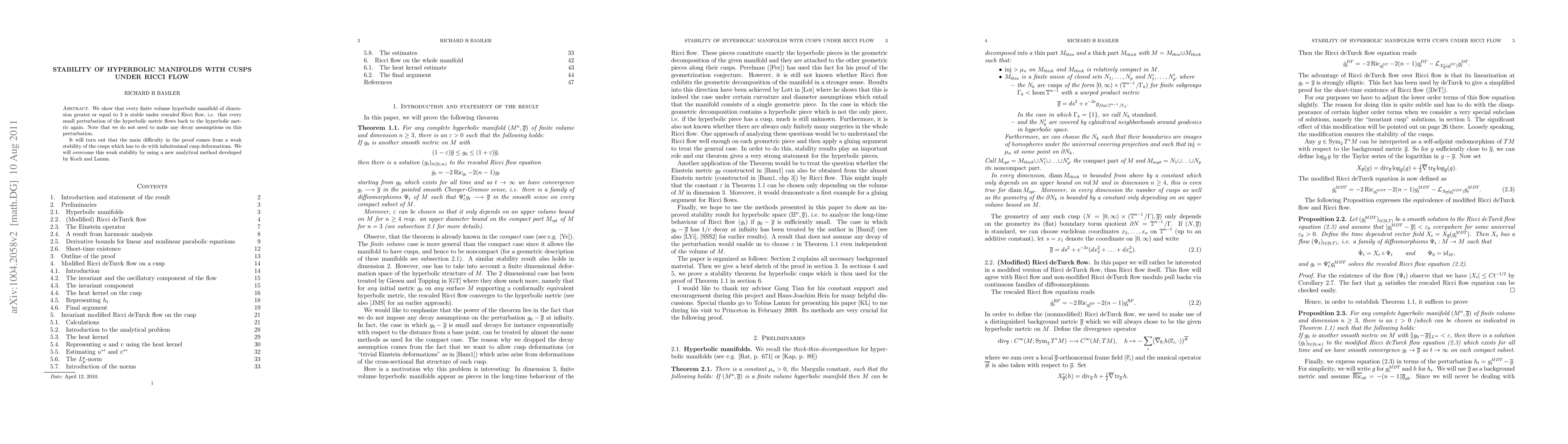 This paper demonstrates the stability of finite volume hyperbolic manifolds of dimension three or higher under Ricci flow, showing that small perturbations revert to the original hyperbolic metric. The main challenge arises from the weak stability of cusps, which is resolved using a novel analytical method by Koch and Lamm.