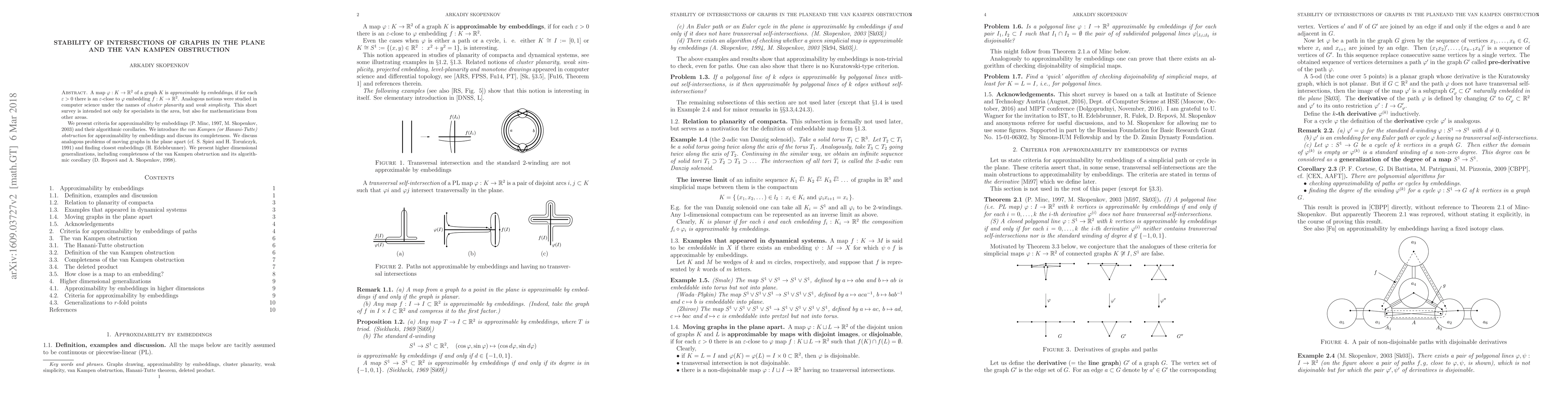 A map $\varphi:K\to R^2$ of a graph $K$ is approximable by embeddings, if for each $\varepsilon>0$ there is an $\varepsilon$-close to $\varphi$ embedding $f:K\to R^2$. Analogous notions were studied in computer science under the names of cluster planarity and weak simplicity. This short survey is intended not only for specialists in the area, but also for mathematicians from other areas. We present criteria for approximability by embeddings (P. Minc, 1997, M. Skopenkov, 2003) and their algorithmic corollaries. We introduce the van Kampen (or Hanani-Tutte) obstruction for approximability by embeddings and discuss its completeness. We discuss analogous problems of moving graphs in the plane apart (cf. S. Spiez and H. Torunczyk, 1991) and finding closest embeddings (H. Edelsbrunner). We present higher dimensional van Kampen obstruction, its completeness result and algorithmic corollary (D. Repovs and A. Skopenkov, 1998).