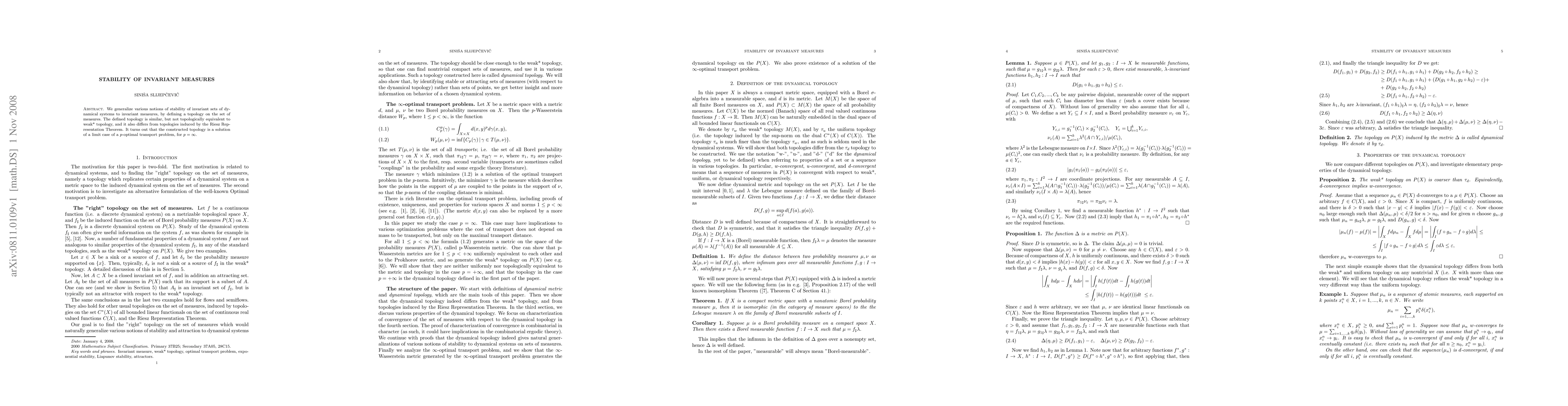 This paper generalizes stability notions for invariant sets to invariant measures by defining a new topology on the set of measures. The proposed topology resolves a limit case of an $p$-optimal transport problem for $p=\infty$, differing from both weak* topology and topologies from the Riesz Representation Theorem.