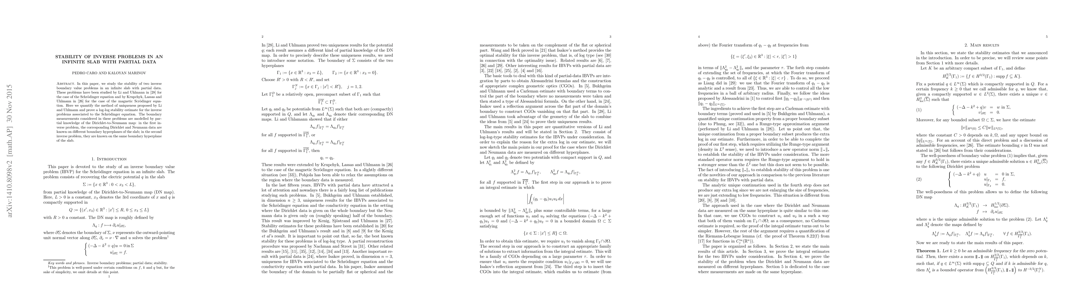 This paper investigates the stability of two inverse boundary value problems in an infinite slab using partial data, extending previous work on the Schrödinger and magnetic Schrödinger equations. It provides a log-log stability estimate and quantifies the method of uniqueness for the inverse problems associated with the Schrödinger equation.