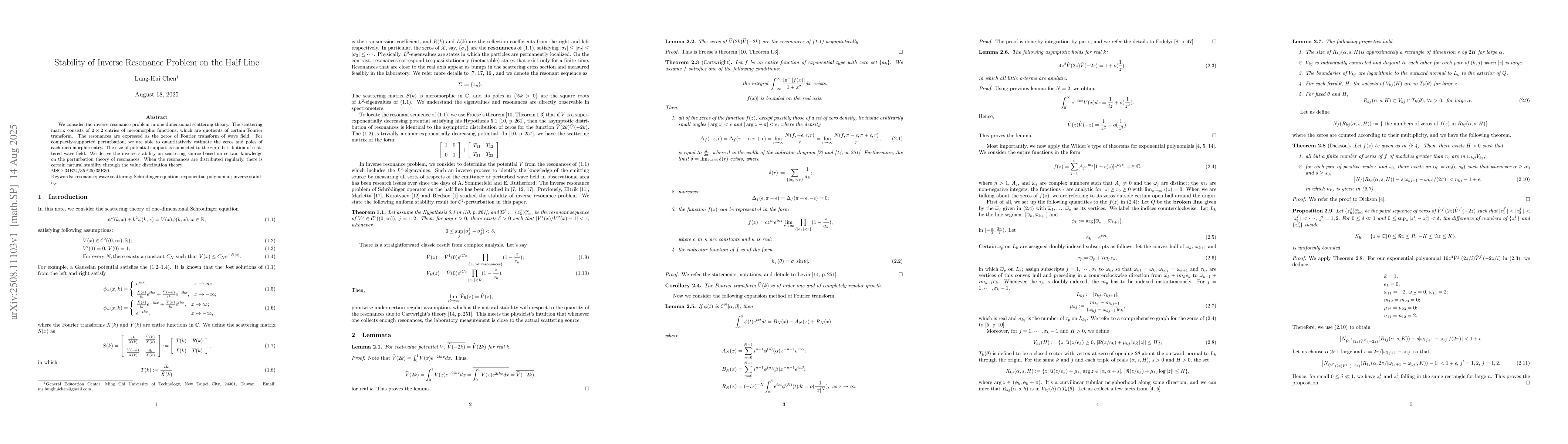 We consider the inverse resonance problem in one-dimensional scattering theory. The scattering matrix consists of $2\times 2$ entries of meromorphic functions, which are quotients of certain Fourier transform. The resonances are expressed as the zeros of Fourier transform of wave field. For compactly-supported perturbation, we are able to quantitatively estimate the zeros and poles of each meromorphic entry. The size of potential support is connected to the zero distribution of scattered wave field. We derive the inverse stability on scattering source based on certain knowledge on the perturbation theory of resonances. When the resonances are distributed regularly, there is certain natural stability through the value distribution theory.