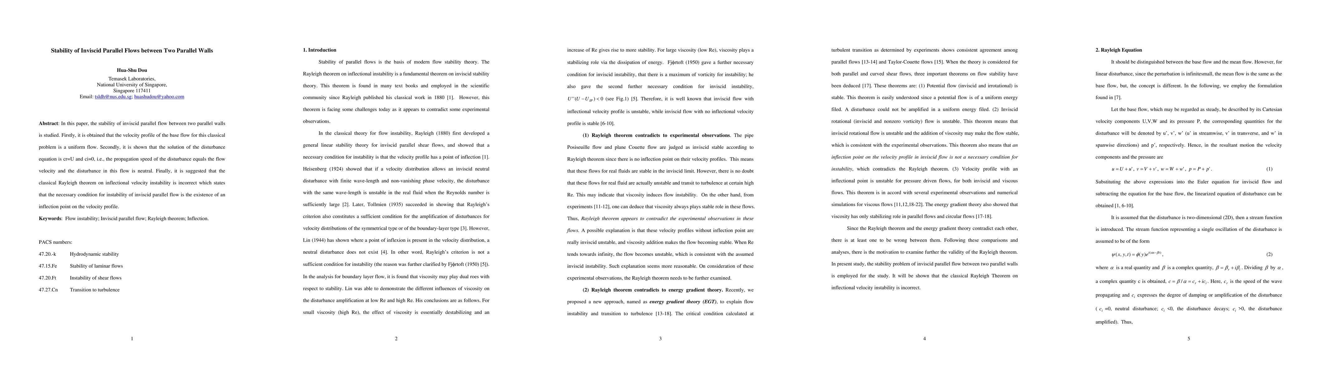 This paper investigates the stability of inviscid parallel flow between two parallel walls, finding a uniform base flow profile and neutral disturbance propagation at the flow velocity, while challenging the classical Rayleigh Theorem's claim on inflectional velocity instability.