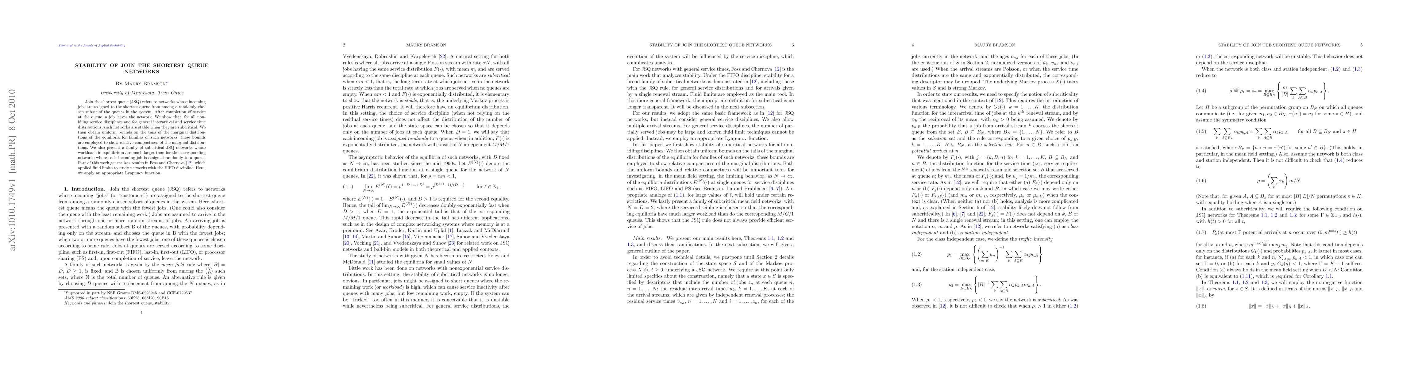 Join the shortest queue (JSQ) refers to networks whose incoming jobs are assigned to the shortest queue from among a randomly chosen subset of the queues in the system. After completion of service at the queue, a job leaves the network. We show that, for all non- idling service disciplines and for general interarrival and service time distributions, such networks are stable when they are subcritical. We then obtain uniform bounds on the tails of the marginal distributions of the equilibria for families of such networks; these bounds are employed to show relative compactness of the marginal distributions. We also present a family of subcritical JSQ networks whose workloads in equilibrium are much larger than for the corresponding networks where each incoming job is assigned randomly to a queue. Part of this work generalizes results in Foss and Chernova [12], which applied fluid limits to study networks with the FIFO discipline. Here, we apply an appropriate Lyapunov function.