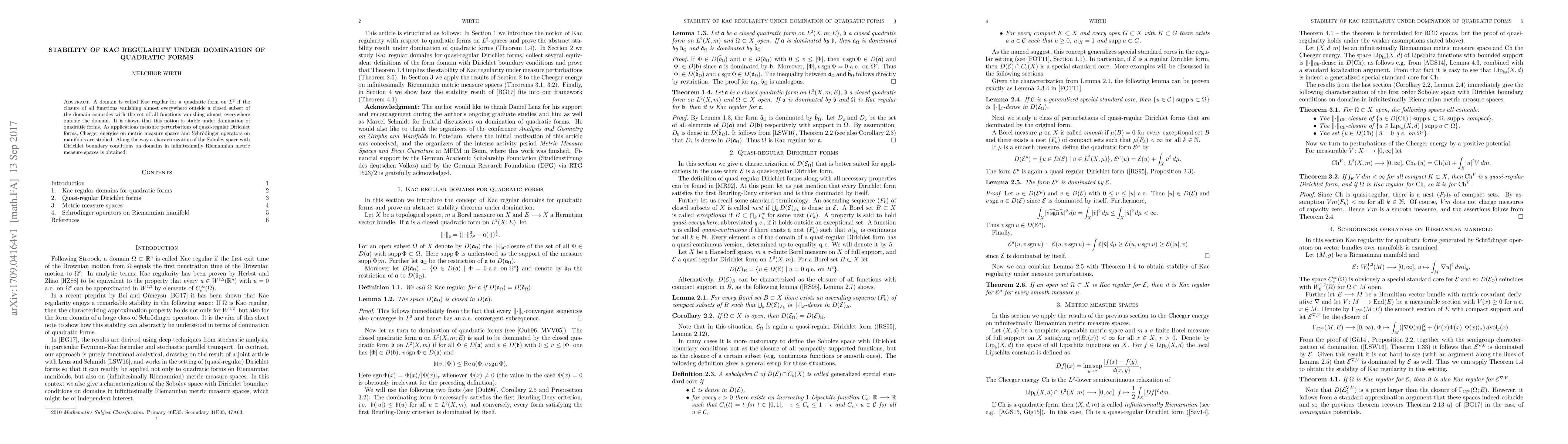 A domain is called Kac regular for a quadratic form on $L^2$ if the closure of all functions vanishing almost everywhere outside a closed subset of the domain coincides with the set of all functions vanishing almost everywhere outside the domain. It is shown that this notion is stable under domination of quadratic forms. As applications measure perturbations of quasi-regular Dirichlet forms, Cheeger energies on metric measure spaces and Schr\"odinger operators on manifolds are studied. Along the way a characterization of the Sobolev space with Dirichlet boundary conditions on domains in infinitesimally Riemannian metric measure spaces is obtained.