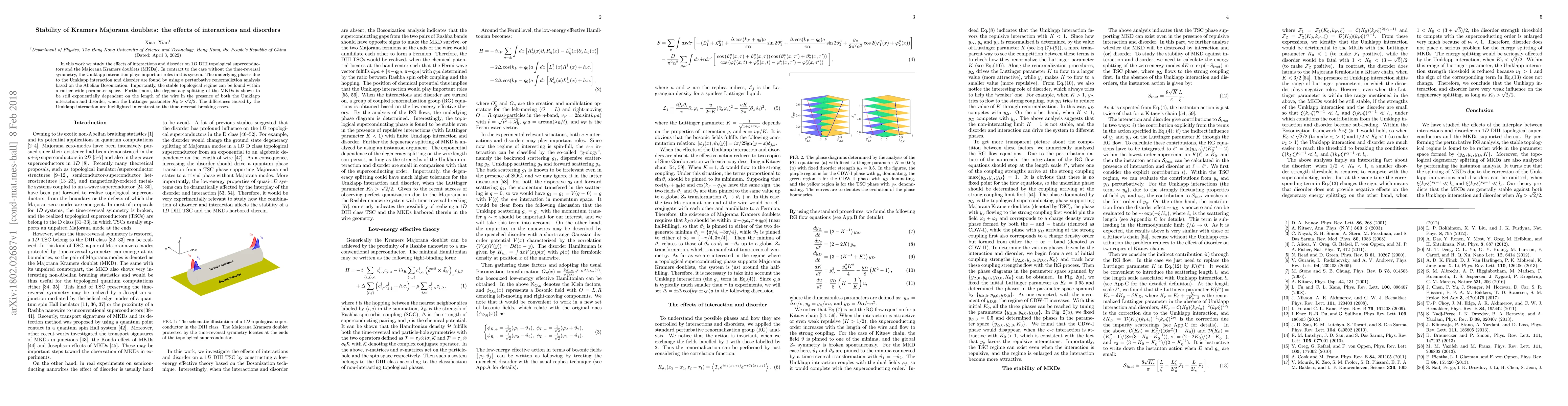 In this work we study the effects of interactions and disorder on $1D$ DIII topological superconductors and the Majorana Kramers doublets (MKDs). In contract to the case without the time-reversal symmetry, the Umklapp interaction plays important roles in this system. The underlying phases due to the Umklapp interaction and disorder are found by using a perturbative renormaliztion analysis based on the Abelian Bosonization. Importantly, the stable topological regime can be found within a rather wide parameter space. Furthermore, the degeneracy splitting of the MKDs is shown to be still exponentially dependent on the length of the wire in the presence of both the Umklapp interaction and disorder, when the Luttinger parameter $K_0>\sqrt{2}/2$. The differences caused by the Umklapp interaction are highlighted in contrast to the time-reversal breaking cases.