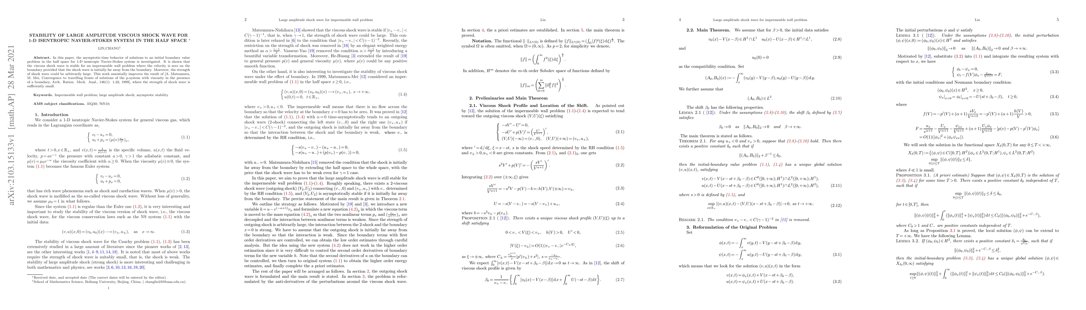 This paper investigates the asymptotic stability of large amplitude viscous shock waves in a 1-D isentropic Navier-Stokes system under boundary conditions. It demonstrates that the shock wave remains stable even when initially far from the boundary, improving upon previous results that required the shock wave to be of small strength.