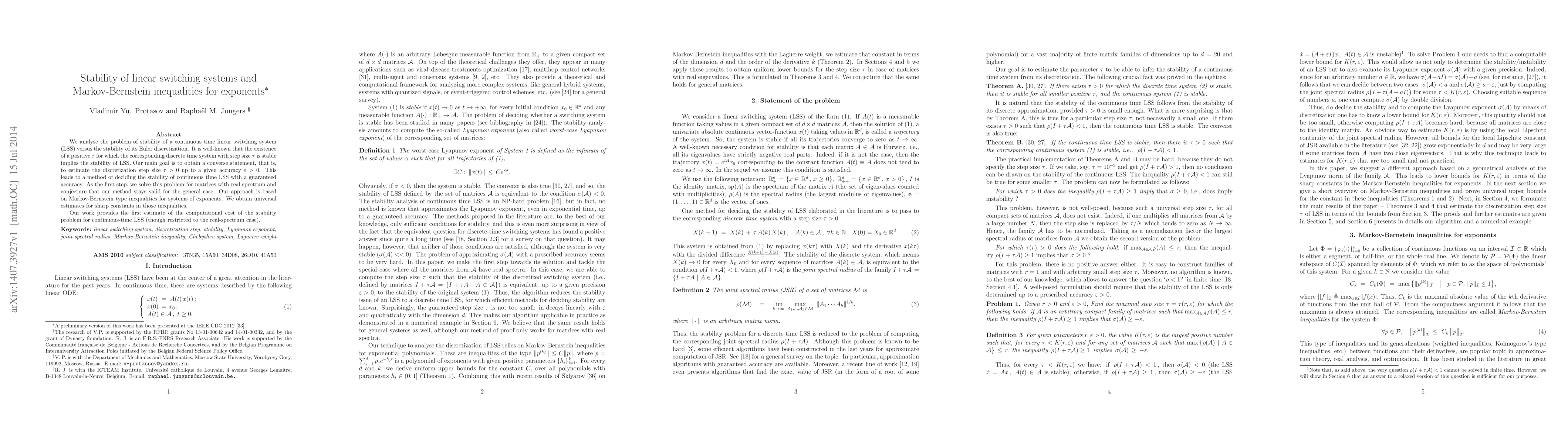 We analyse the problem of stability of a continuous time linear switching system (LSS) versus the stability of its Euler discretization. It is well-known that the existence of a positive {\tau} for which the corresponding discrete time system with step size {\tau} is stable implies the stability of LSS. Our main goal is to obtain a converse statement, that is, to estimate the discretization step size {\tau} > 0 up to a given accuracy {\epsilon} > 0. This leads to a method of deciding the stability of continuous time LSS with a guaranteed accuracy. As the first step, we solve this problem for matrices with real spectrum and conjecture that our method stays valid for the general case. Our approach is based on Markov-Bernstein type inequalities for systems of exponents. We obtain universal estimates for sharp constants in those inequalities. Our work provides the first estimate of the computational cost of the stability problem for continuous-time LSS (though restricted to the real-spectrum case).