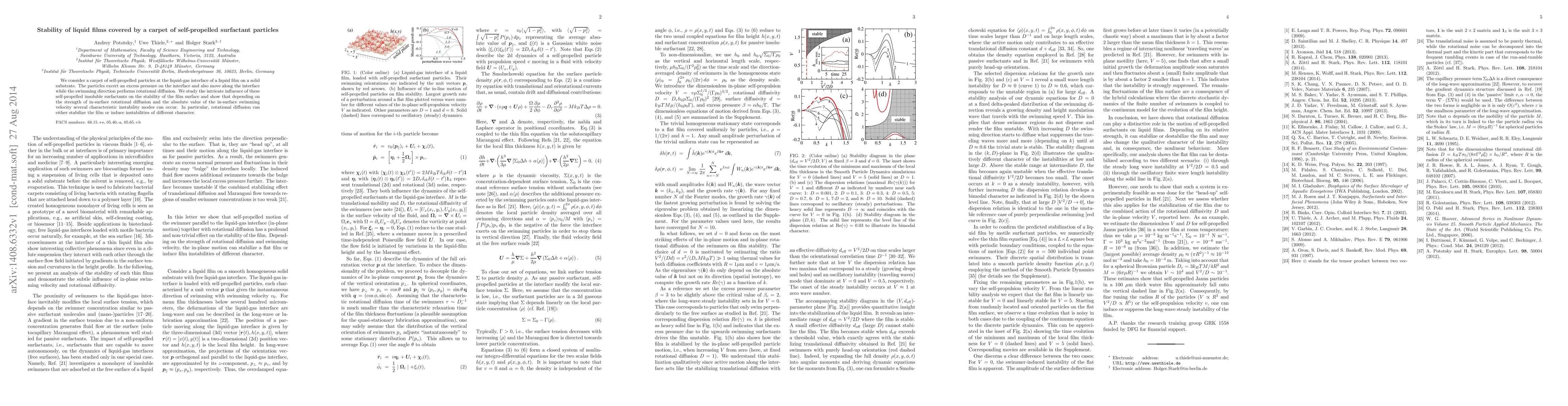 This study investigates how self-propelled surfactant particles at a liquid-gas interface affect the stability of liquid films on a solid substrate. The research reveals that the rotational diffusion and swimming velocity of these particles can either stabilize the film or induce various instability modes, depending on their interaction dynamics.