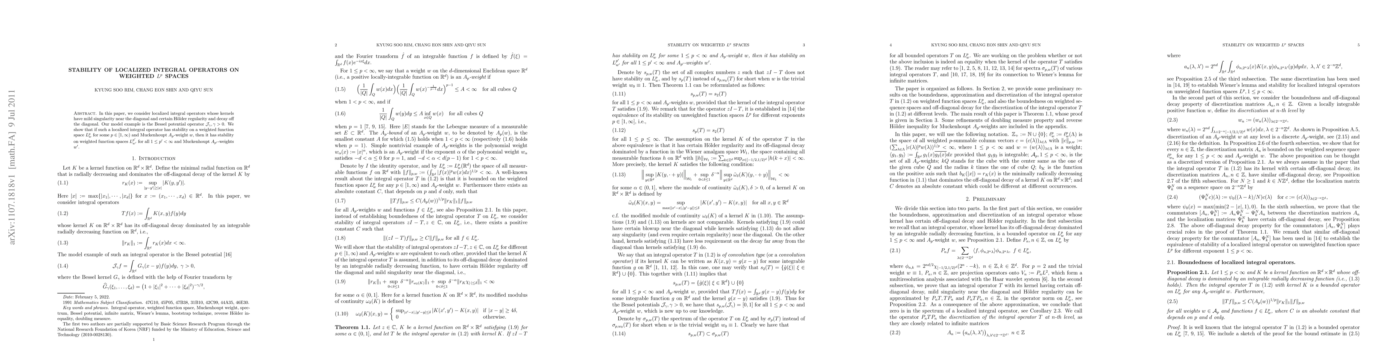 In this paper, we consider localized integral operators whose kernels have mild singularity near the diagonal and certain Holder regularity and decay off the diagonal. Our model example is the Bessel potential operator ${\mathcal J}_\gamma, \gamma>0$. We show that if such a localized integral operator has stability on a weighted function space $L^p_w$ for some $p\in [1, \infty)$ and Muckenhoupt $A_p$-weight $w$, then it has stability on weighted function spaces $L^{p'}_{w'}$ for all $1\le p'<\infty$ and Muckenhoupt $A_{p'}$-weights $w'$.
