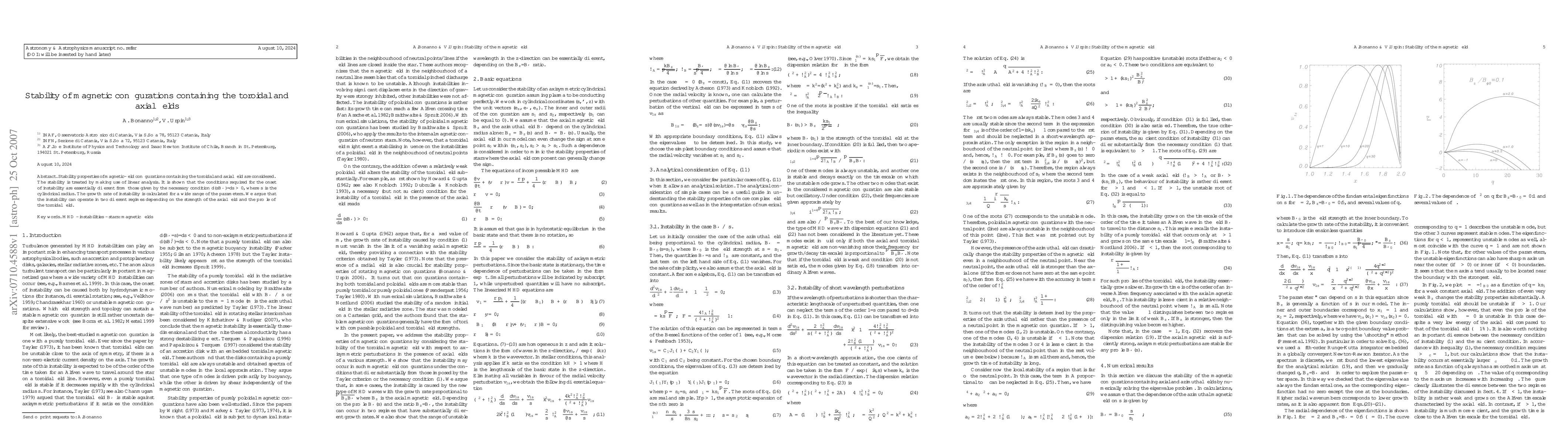 This paper investigates the stability of magnetic configurations with toroidal and axial fields using linear analysis, revealing that instability conditions differ from those given by the $d (s B_{\phi})/ds > 0$ criterion. The study calculates the growth rate of instability across various parameters and identifies two operational regimes for the instability based on axial field strength and toroidal field profile.