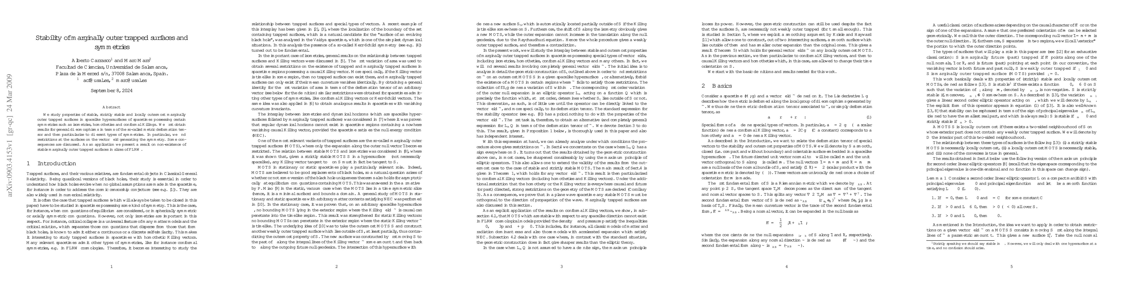 This paper investigates the stability of marginally outer trapped surfaces in symmetric spacetimes, deriving results for general diffeomorphisms and specific symmetries like isometries. It finds restrictions on the vector field generating the symmetry and concludes with the non-existence of stable marginally outer trapped surfaces in FLRW slices.