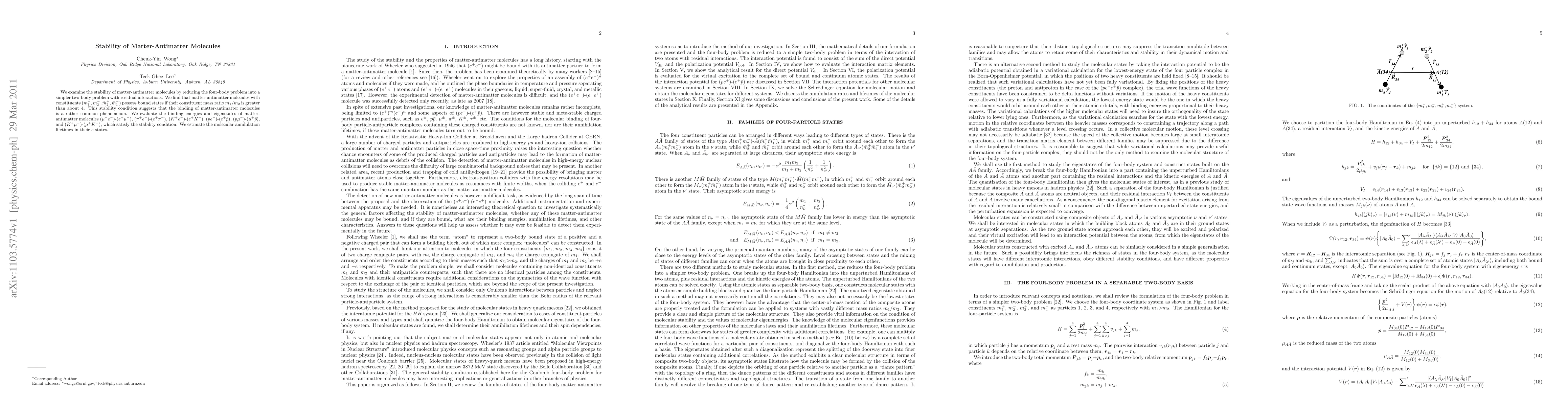 We examine the stability of matter-antimatter molecules by reducing the four-body problem into a simpler two-body problem with residual interactions. We find that matter-antimatter molecules with constituents (m1+, m2-, m2bar+, m1bar-) possess bound states if their constituent mass ratio m1/m2 is greater than about 4. This stability condition suggests that the binding of matter-antimatter molecules is a rather common phenomenon. We evaluate the binding energies and eigenstates of matter-antimatter molecules (mu+ e-)-(e+ mu-), (pi+ e-)-(e+ pi-), (K+ e-)-(e+ K-), (p e-)-(e+ pbar), (p mu-)-(mu+ pbar), and (K+ mu-)-(mu+ K-), which satisfy the stability condition. We estimate the molecular annihilation lifetimes in their s states.