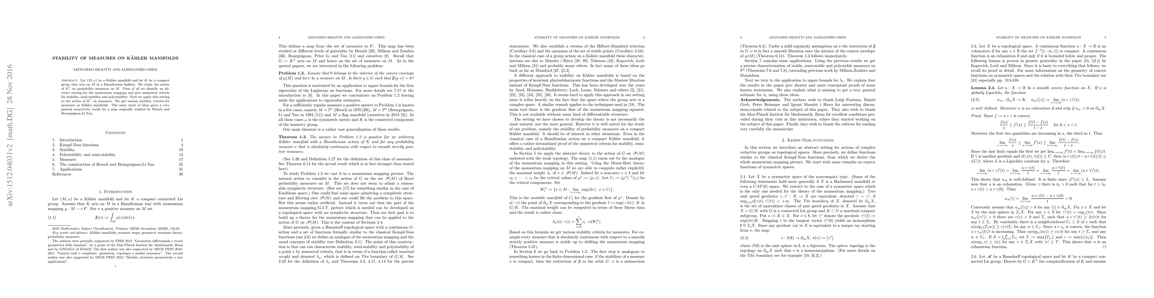 This paper explores the stability of probability measures on Kähler manifolds under the action of a complexification of a compact group. It establishes criteria for stability, semi-stability, and polystability, and applies these to derive stability criteria for measures, as well as a general surjectivity result for a relevant map.