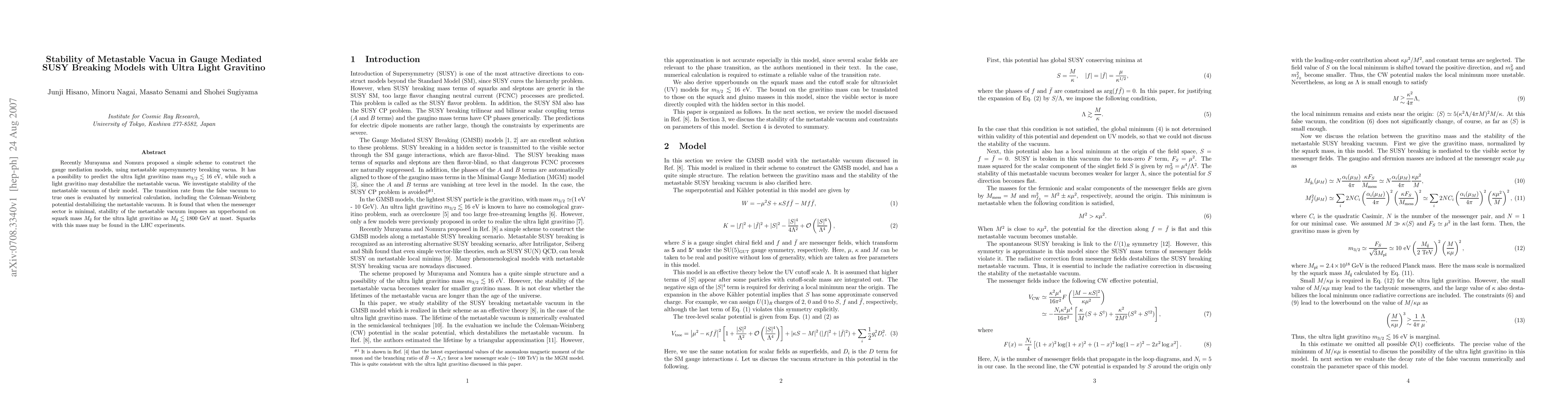 This paper explores the stability of metastable vacua in gauge-mediated SUSY breaking models, where ultra-light gravitino masses can be predicted. Numerical calculations show that the metastable vacuum remains stable if the squark mass is below approximately 1800 GeV, a range potentially accessible at the LHC.