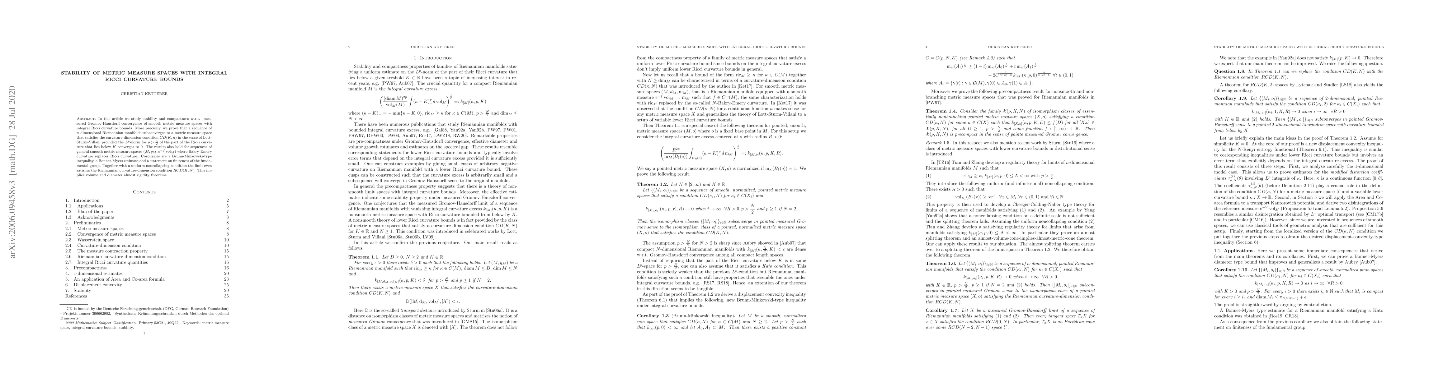 In this article we study stability and compactness w.r.t. measured Gromov-Hausdorff convergence of smooth metric measure spaces with integral Ricci curvature bounds. More precisely, we prove that a sequence of $n$-dimensional Riemannian manifolds subconverges to a metric measure space that satisfies the curvature-dimension condition $CD(K,n)$ in the sense of Lott-Sturm-Villani provided the $L^p$-norm for $p>\frac{n}{2}$ of the part of the Ricci curvature that lies below $K$ converges to $0$. The results also hold for sequences of general smooth metric measure spaces $(M,g_M, e^{-f}\mbox{vol}_M)$ where Bakry-Emery curvature replaces Ricci curvature. Corollaries are a Brunn-Minkowski-type inequality, a Bonnet-Myers estimate and a statement on finiteness of the fundamental group. Together with a uniform noncollapsing condition the limit even satisfies the Riemannian curvature-dimension condition $RCD(K,N)$. This implies volume and diameter almost rigidity theorems.