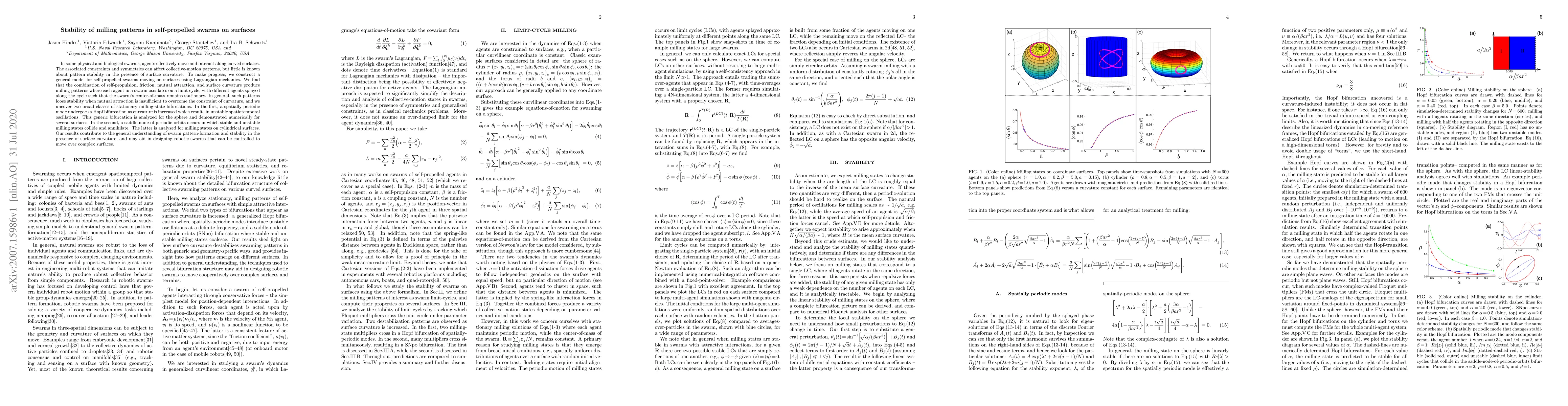 The research utilizes Lagrangian mechanics to model self-propelled swarms moving on surfaces, analyzing the stability of milling patterns under surface curvature constraints.