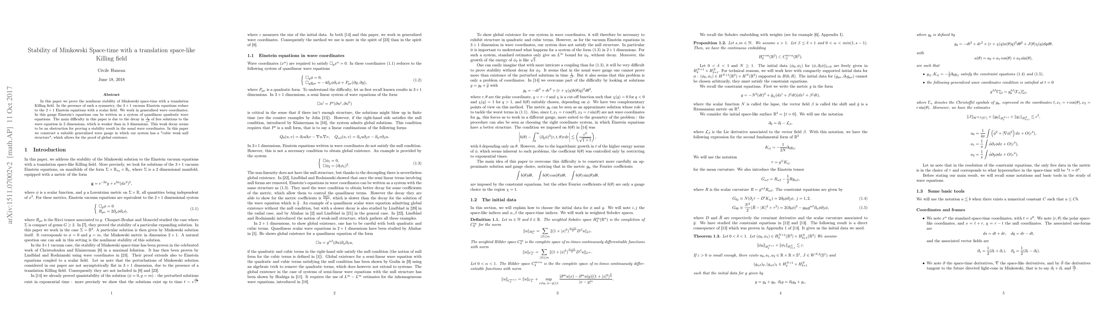 This paper proves the nonlinear stability of Minkowski space-time with a translation space-like Killing field, showing that the reduced 2+1 Einstein equations with a scalar field can be handled in a generalized wave coordinate system. The key innovation is the construction of a "cubic weak null structure" in this gauge to overcome the challenges posed by the weaker decay of wave solutions in two dimensions.