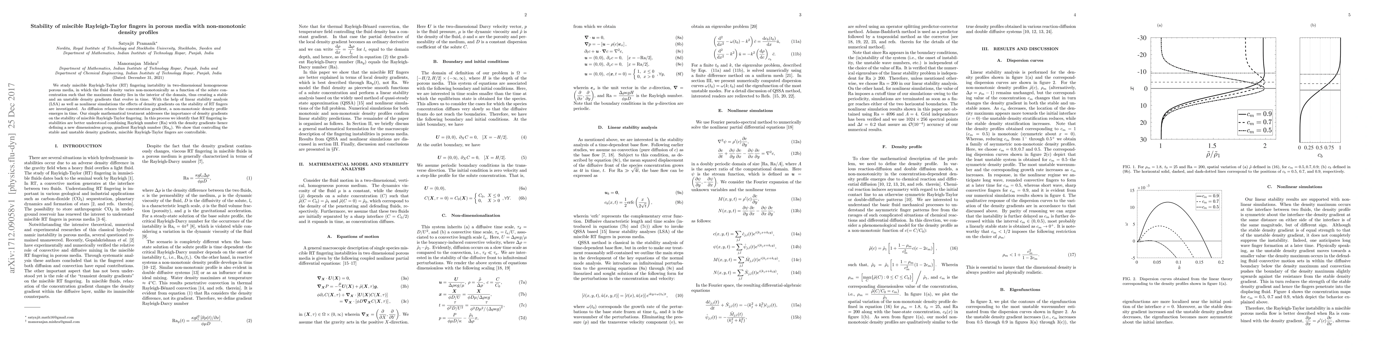 This paper investigates the stability of miscible Rayleigh-Taylor fingers in porous media with non-monotonic density profiles, employing linear stability analysis and nonlinear simulations. It introduces a new dimensionless group, the gradient Rayleigh number (Ra$_g$), to better understand the interplay between density gradients and RT instabilities, demonstrating that controlling these gradients can manage the behavior of RT fingers.
