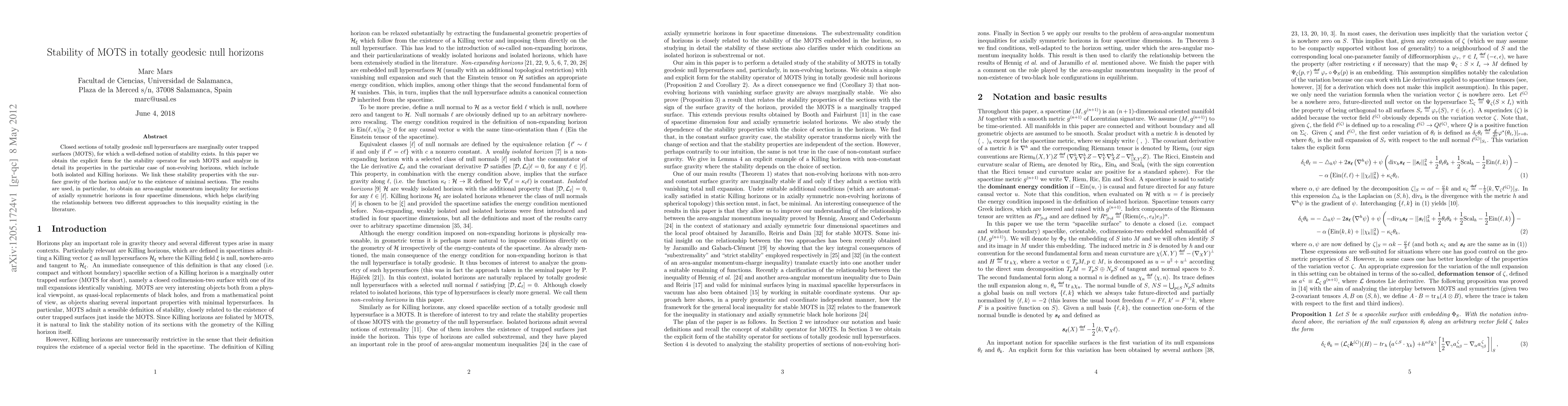 This paper derives the explicit stability operator for marginally outer trapped surfaces (MOTS) in totally geodesic null horizons and examines its properties, particularly in non-evolving horizons. It links the stability to surface gravity and minimal sections, and uses the findings to clarify an area-angular momentum inequality for axially symmetric horizons in four dimensions.