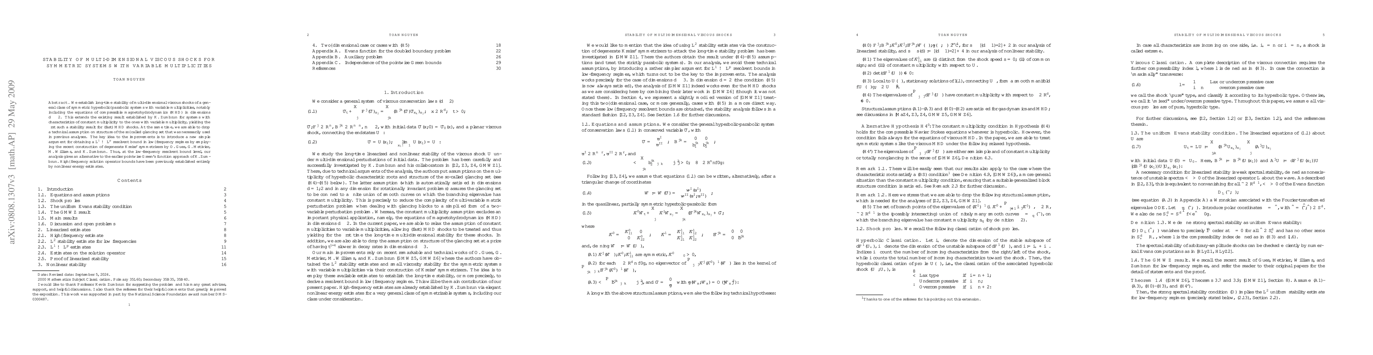 This paper establishes long-term stability for multi-dimensional viscous shocks in symmetric hyperbolic-parabolic systems with variable multiplicities, notably including compressible MHD. It extends previous stability results by eliminating a technical assumption and introducing a new low-frequency resolvent bound method.