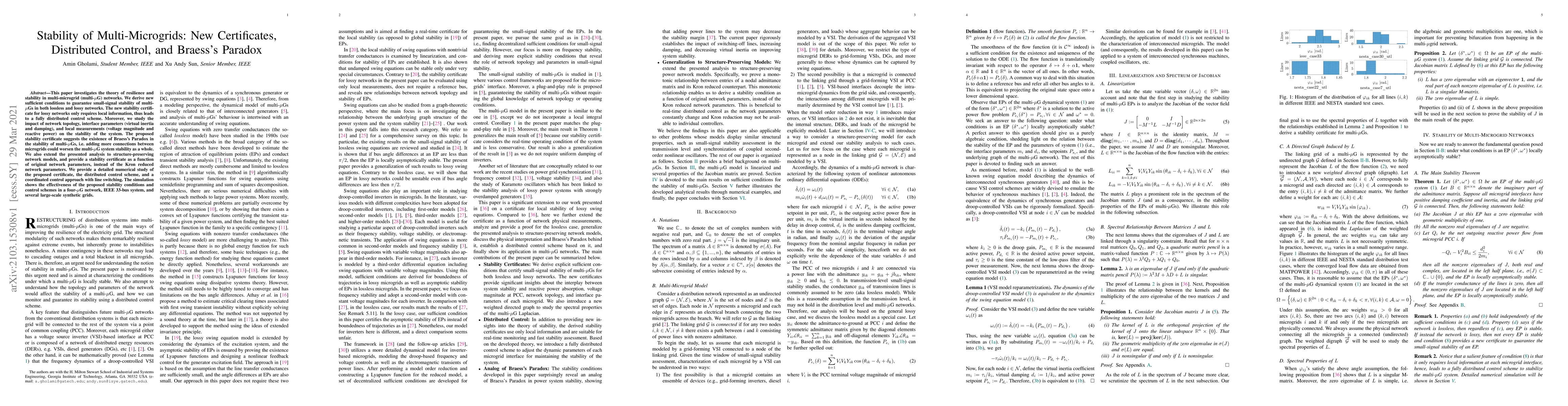 This paper develops new stability certificates for multi-microgrids, enabling fully distributed control and revealing Braess's Paradox in network stability. It also demonstrates the effectiveness of the proposed methods through extensive simulations on various network topologies.