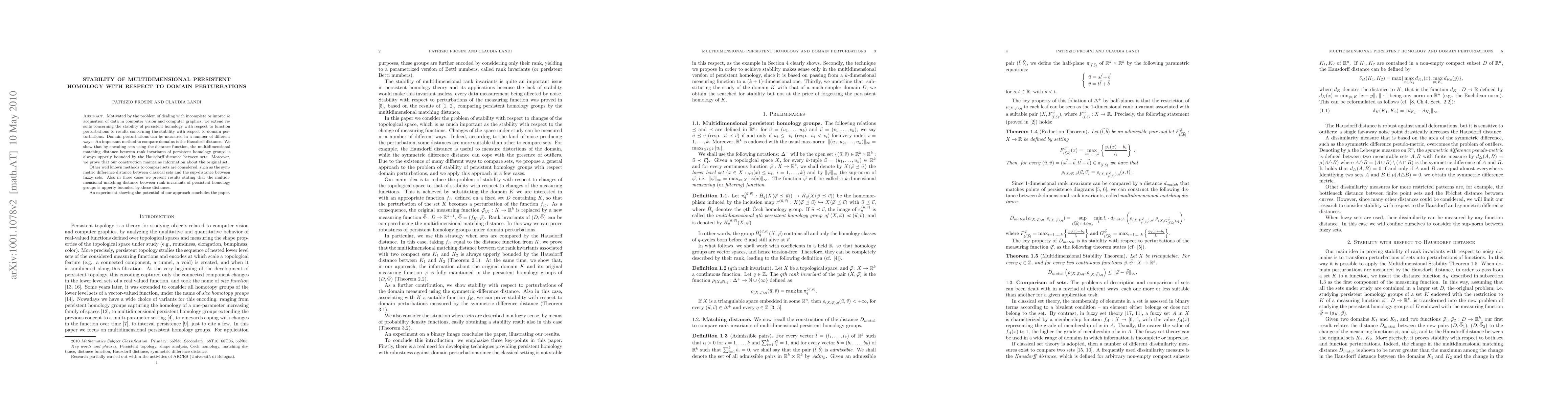 Motivated by the problem of dealing with incomplete or imprecise acquisition of data in computer vision and computer graphics, we extend results concerning the stability of persistent homology with respect to function perturbations to results concerning the stability with respect to domain perturbations. Domain perturbations can be measured in a number of different ways. An important method to compare domains is the Hausdorff distance. We show that by encoding sets using the distance function, the multidimensional matching distance between rank invariants of persistent homology groups is always upperly bounded by the Hausdorff distance between sets. Moreover we prove that our construction maintains information about the original set. Other well known methods to compare sets are considered, such as the symmetric difference distance between classical sets and the sup-distance between fuzzy sets. Also in these cases we present results stating that the multidimensional matching distance between rank invariants of persistent homology groups is upperly bounded by these distances. An experiment showing the potential of our approach concludes the paper.