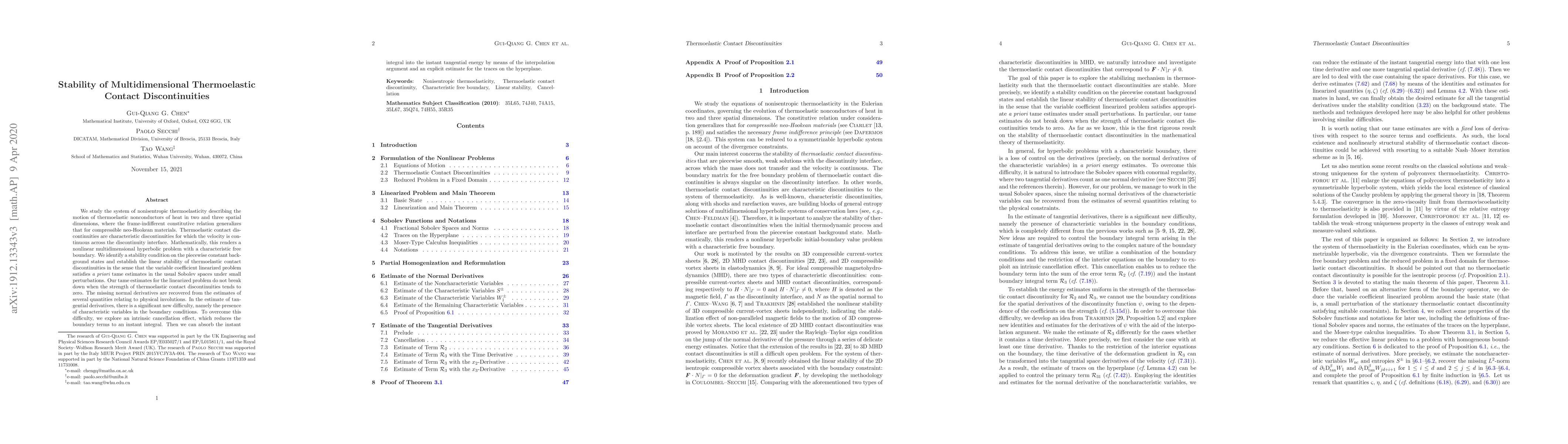 This paper investigates the stability of thermoelastic contact discontinuities in nonisentropic thermoelastic materials, establishing linear stability under small perturbations. It employs intrinsic cancellation effects to manage boundary terms and recover missing normal derivatives, ensuring stability estimates hold even as discontinuity strength diminishes.