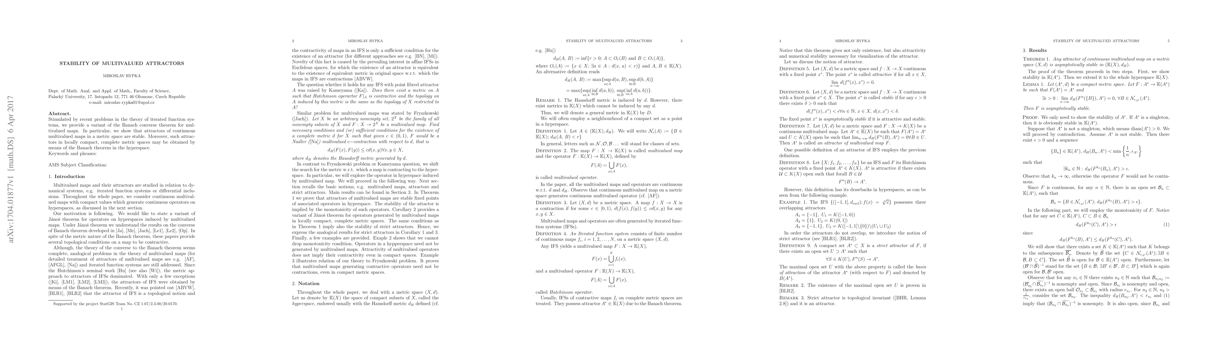 This paper proves that attractors of continuous multivalued maps in metric spaces are stable, building on the Banach converse theorem and its application to locally compact, complete metric spaces.