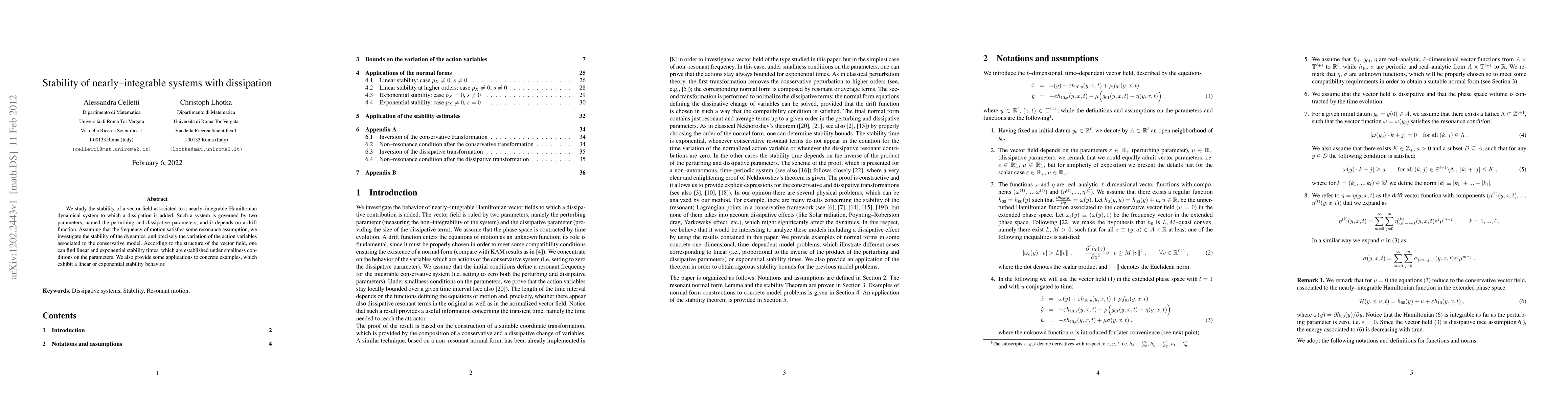 We study the stability of a vector field associated to a nearly-integrable Hamiltonian dynamical system to which a dissipation is added. Such a system is governed by two parameters, named the perturbing and dissipative parameters, and it depends on a drift function. Assuming that the frequency of motion satisfies some resonance assumption, we investigate the stability of the dynamics, and precisely the variation of the action variables associated to the conservative model. According to the structure of the vector field, one can find linear and exponential stability times, which are established under smallness con- ditions on the parameters. We also provide some applications to concrete examples, which exhibit a linear or exponential stability behavior.